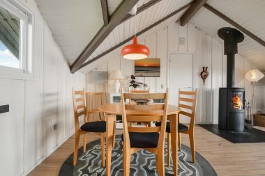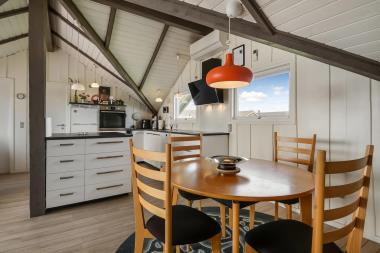 Huset har i 2019/20 gennemgået gennemgribende istandsættelse, hvor det også har fået ny dejlig brændeovn og økonomisk varmepumpe, som sammen sørger for hygge, samt muliggør et altid varmt og rart hus, uanset vejr og årstid. Det nye lækre køkken er veludstyret. Der er bl.a. varmluftsovn og keramiske kogeplader, emhætte, opvaskemaskine, mikroovn gemt væk i skab og køleskab med fryser. Desuden æggekoger, brødrister, kaffemaskine, kogekande, håndmixer og stavblender. Badeværelse med sauna, toilet, bruser, håndvask og klinkegulv med gulvvarme. Fra både terrasse og stue har man en fantastisk panorama-udsigt til Ferring Sø samt udsigt til de høje klitter ved Vesterhavet. Ikke ryger hus. 1 husdyr er tilladt. Har man el-bil eller en Plug-In hybrid, så er der ved huset 3-faset 16amp CEE stik, der kan lade op til 11 kWh.