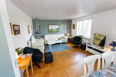 Huset er i 2 etager og er lyst og moderne. Stue og køkken er i samme rum og her er et behageligt trægulv. Køkkenet har glaskeramisk komfur, emhætte og køle/fryseskab. Stuen byder på brændeovn til træpiller (træpiller kan købes hos XL byg) spisebord, sofagruppe og hyggeligt møblement med fjernsyn hvor man kan se både tyske og danske kanaler blandt andet TV2. Herudover er der også DVD-afspiller tilknyttet.