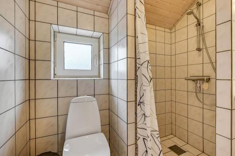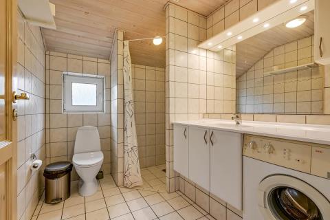 Badeværelse: Toilet, håndvask, bruser og gulvvarme. Vaskemaskine og tørretumbler