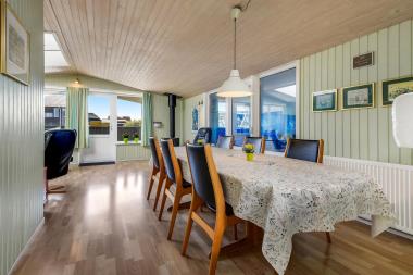 Sommerhuset er velindrettet og velegnet til to familier. Sommerhuset er indrettet med kombineret stue og køkken. Køkkenet er veludstyret med keramiskkomfur, opvaskemaskine, emhætte, køle/ fryseskab og mikrobølgeovn. Der er ekstra fryser til gæsternes rådighed. Der er pæne lædermøbler i stuen og huset fremstår flot og indbydende. Der er også tænkt på miljøet og investeret i energivenlig luft til vand varmepumpe, som er kombineret med ekstra isolering, så gæsterne sparer på energiomkostningerne til opvarmning. Der er desuden hyggelig brændeovn til at sprede hygge og varme en kølig sommeraften eller en efterårsaften med regn og rusk. I stuen er der TV med danske kanaler med bla. DR og TV2 samt tyske programmer og desuden Chromecast med mulighed for at streame egne programmer. Der er DVD-afspiller, radio, CD-afspiller samt lynhurtig fiber internetforbindelse. Sommerhuset er indrettet med to pæne badeværelser med toilet, håndvask og bruserniece. Begge med behagelig gulvvarme. I husets pool afdeling kan i rigtig slappe af, og se på de flotte vægmalerier mens i bader i den dejlig pool eller bliver gennem varmet og masseret i spabadets varme vand. Efter en lang travetur i naturen er det dejligt at blive varmet igennem i husets store sauna eller nyde det specielle tyrkiskbad. Der er fire gode soveværelser i huset. De tre er indrettet med dobbeltsenge og et med to køjer og plads til fire personer. Der er desuden barneseng og højstol til rådighed for de yngste gæster. Fra stuen er der udgang til husets store lukket terrasser. Der er god plads til at nyde solen og den friske havluft. Det er næsten altid muligt at finde læ ved huset. Der er gode havemøbler, solsenge og grill til gæsternes rådighed, og til de mindste er der gynger og en dejlig stor grund til at boltre sig på. Der er vaskemaskine og tørretumbler til gæsternes rådighed. Depositum vintersæsonen kr. 5500 og sommersæson kr. 3500. 1 husdyr er tilladt.