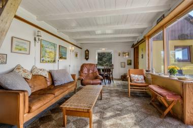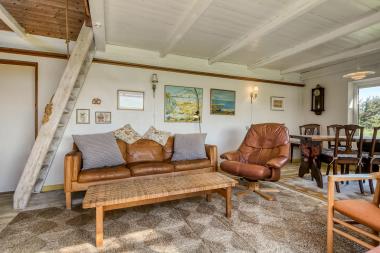 Enkelt indrettet opholdsstue med lædermøbler, spisebord, brændeovn, TV med danske og tyske kanaler samt mulighed for streaming af radio, TV og apps. . 1 soveværelser (1DS) samt stor Hems med (1DS) og flot udsigt (stige til hems er stejl). Nyt, mindre køkken med glaskeramisk komfur, emhætte og køleskab med lille fryseboks. Badeværelse med bruser, toilet og håndvask.