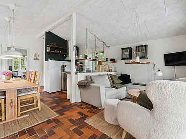 Opholdsstuen er hjemmets naturlige samlingspunkt. Her sørger pejsen og varmepumpen for komforten året rundt, mens udsigten til fjorden giver rummet karakter. Der er naturligvis også internet, så ferien kan kombineres med streaming eller hjemmearbejde.