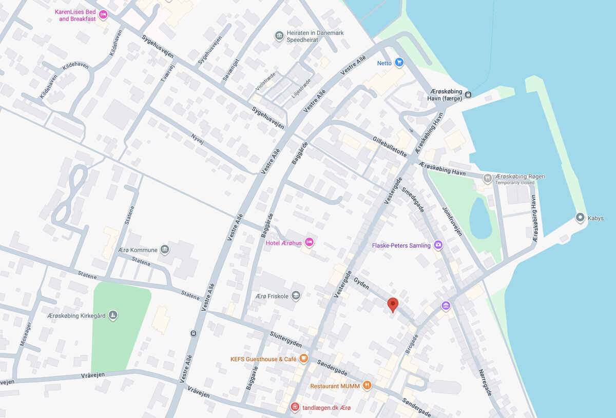 Huset ligger i en gyde, der forbinder hovedgaden med byens torv og et par 100 meter fra havnen og tæt på Marina og badestrand. Der er gåafstand til færgen, og der er mulighed for parkering på havnen. På Ærø er der gratis busser, og du kan nemt komme fra Gyden 16 og rundt på resten af øen. I huset er der to cykler, som kan benyttes. Tæt på kan lejes flere cykler.