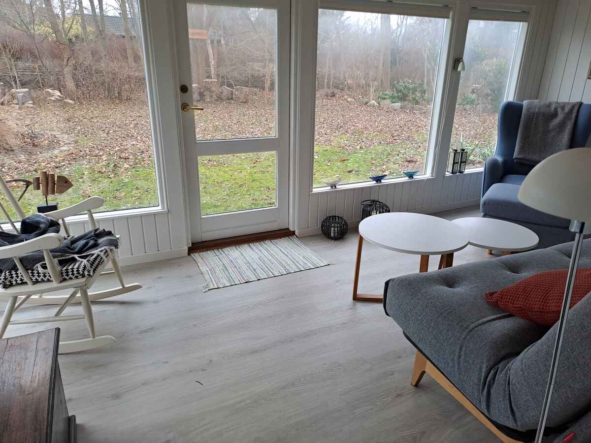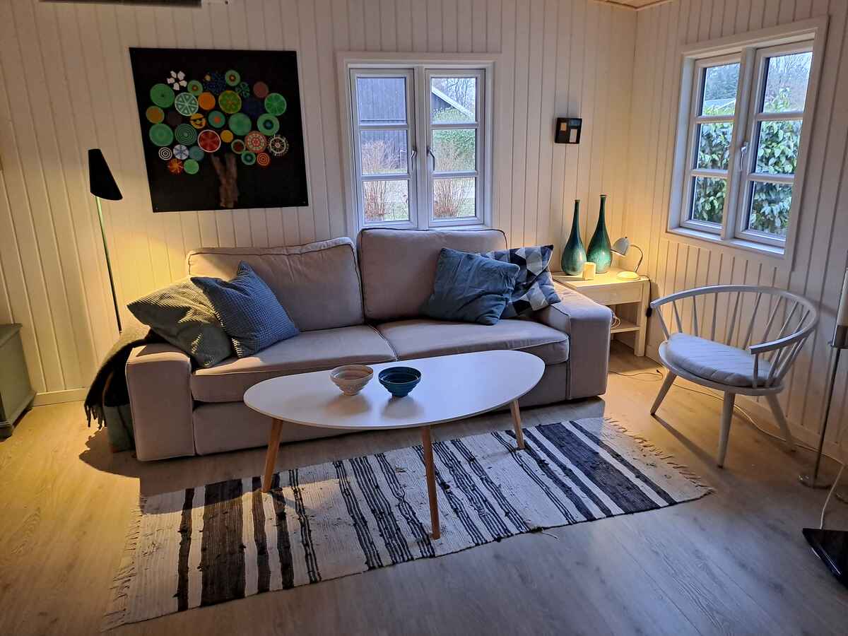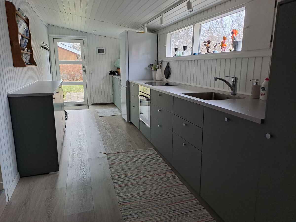 Nyrenoveret (2021–2024) sommerhus med nyt køkken, 2 soveværelser, hyggelig udestue med sovesofa og weekendseng til et barn.