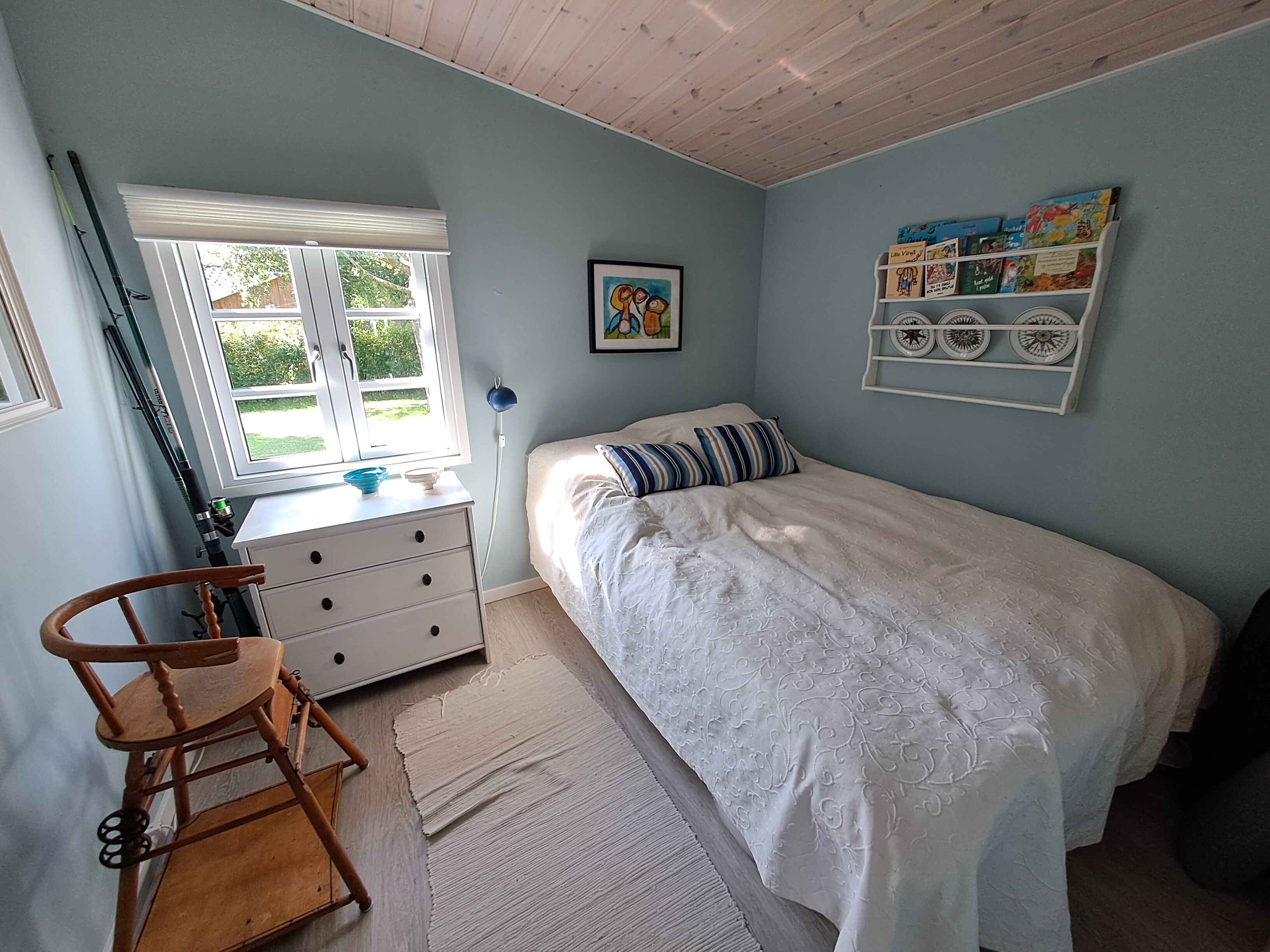 Nyrenoveret (2021–2024) sommerhus med nyt køkken, 2 soveværelser, hyggelig udestue med sovesofa og weekendseng til et barn.