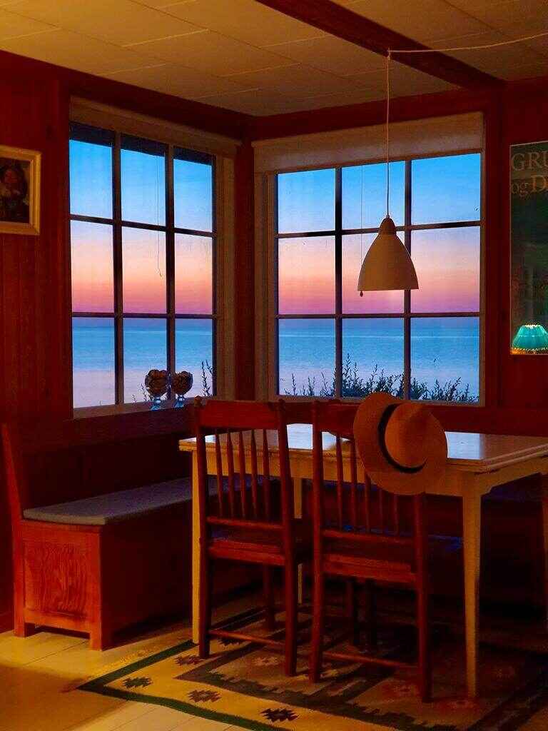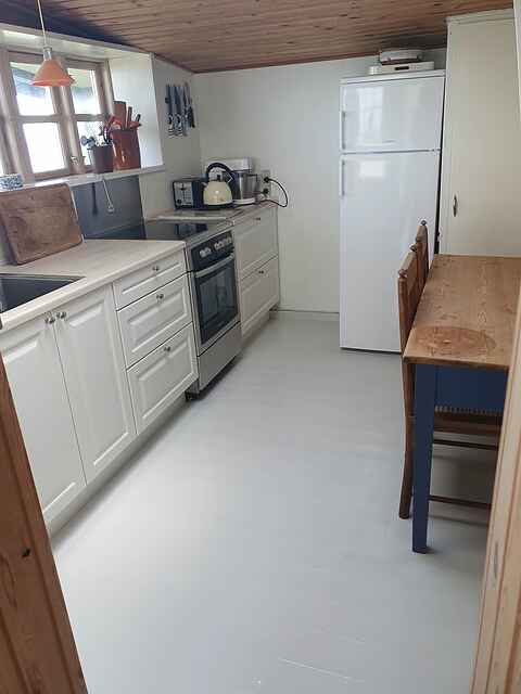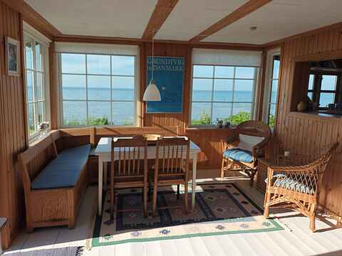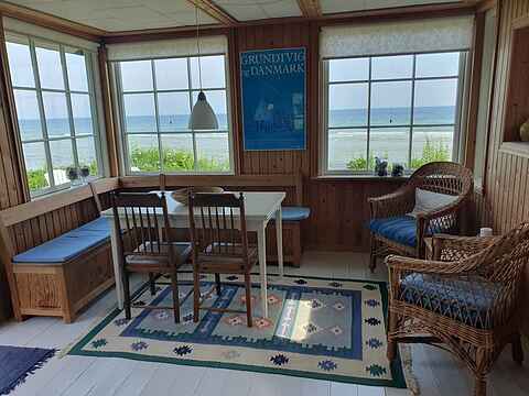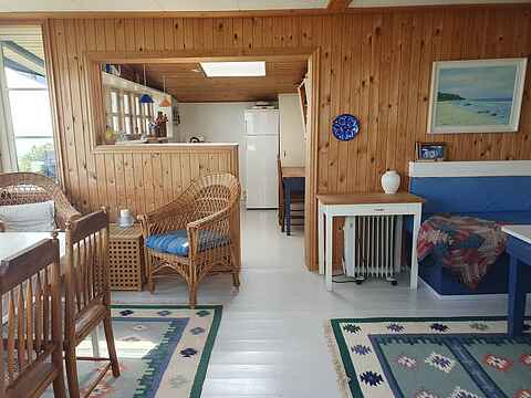 Hyggelig stue med en skøn spiseplads med vinduer ud mod vandet. Der er smart-TV, hvor man kan benytte streaming tjenester via egne abonnementer. Her kan man rigtig nyde morgenkaffen og udsigten. Der er også en dejlig hyggekrog, hvor familien kan spille spil sammen eller måske på mobilen. Køkkenet ligger i åben forbindelse med stuen og har også vinduer ud mod vandet.