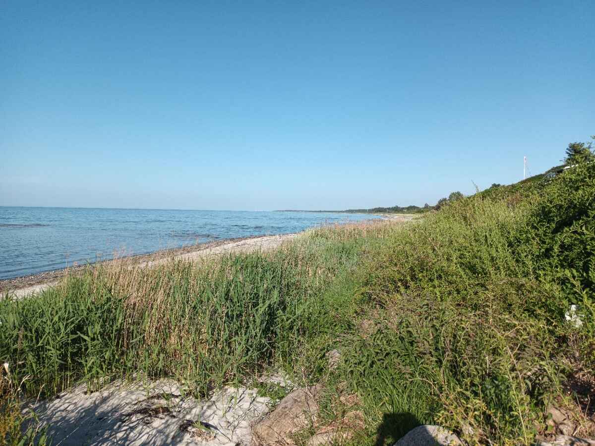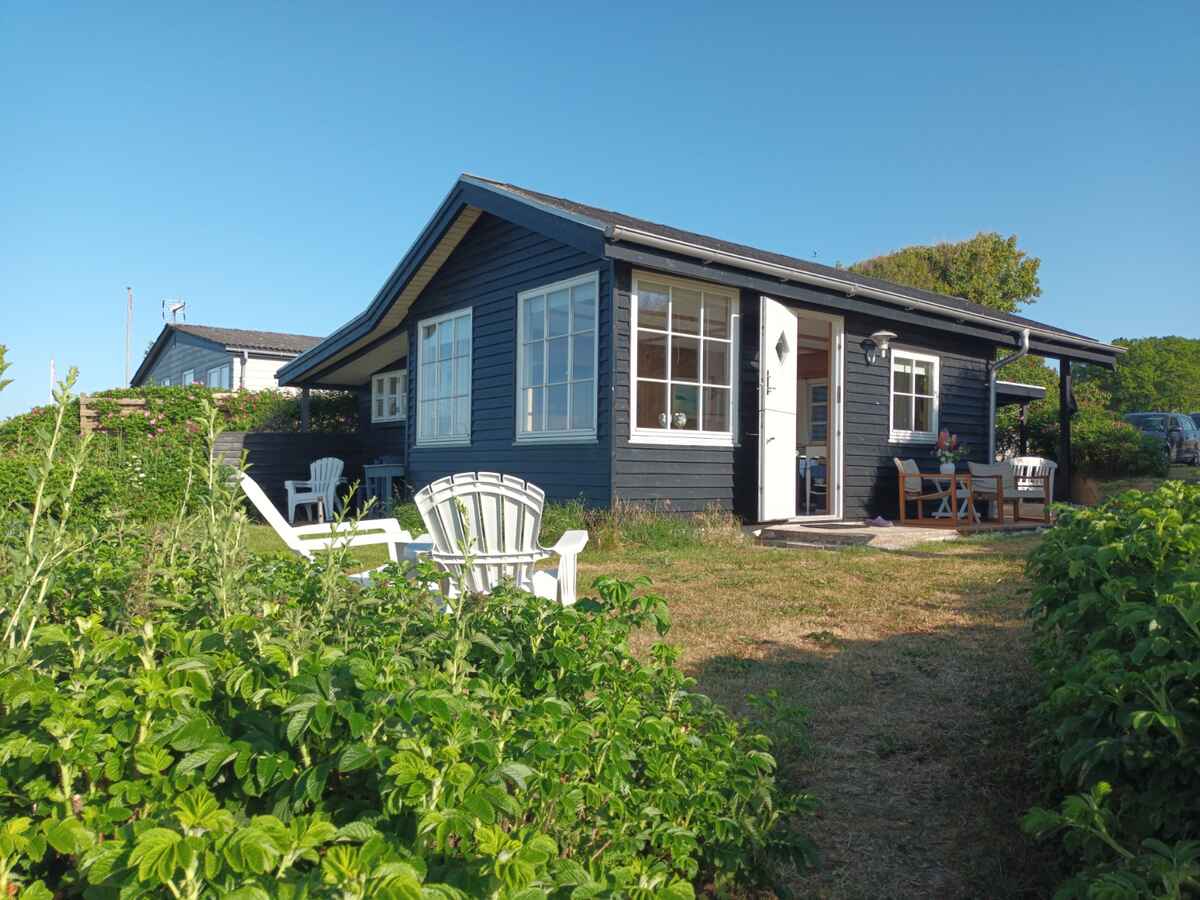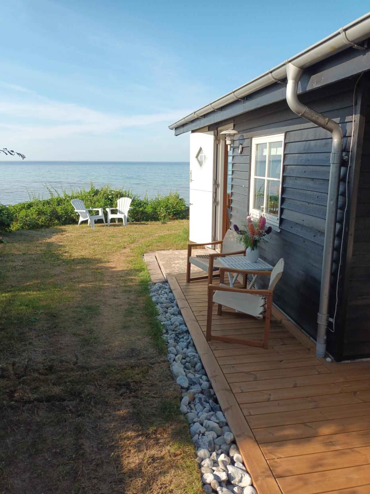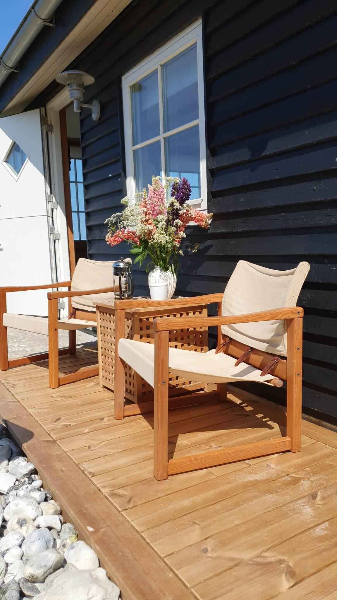 Udenfor er der en hyggelig overdækket terrasse og en åben terrasse – trukket lidt tilbage fra stranden, så der er læ. Der er flere hyggekroge på forskellige sider af huset.