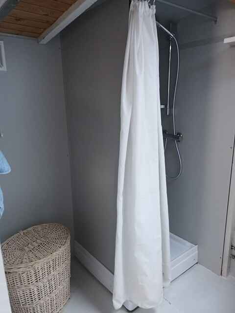 Badeværelse med toilet og brusebad samt vaskemaskine.