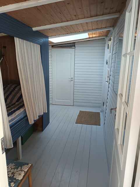 Huset har to soveværelser med dobbeltsenge. Det ene er helt separat med indgang fra terrassen (seng: 180×200 cm), og det andet ligger i huset med adgang til hhv wc/bad og køkken, men altså indrettet som alkove.