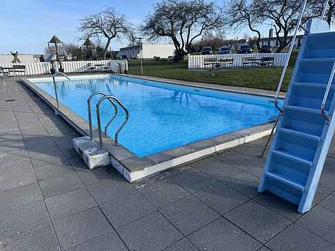 Lejligheden er omgivet af dejlige grønne områder, der indbyder til afslapning og udendørs aktiviteter som hører til området, her er eks.. udendørs opvarmet pool, børnepool begge pools er opvarmet til 24 grader, legeplads med hoppepude, tennisbane ovs… Æbletræerne omkring lejlighederne skaber en rolig og afslappende atmosfære, hvor man virkelig kan slappe af og nyde sommerdagene.