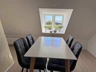 På første sal er der to soveværelser samt en ydeligere stue med sofa, spisebord og ekstra sengeplads. I alt er der plads til op til 12 overnattende gæster.