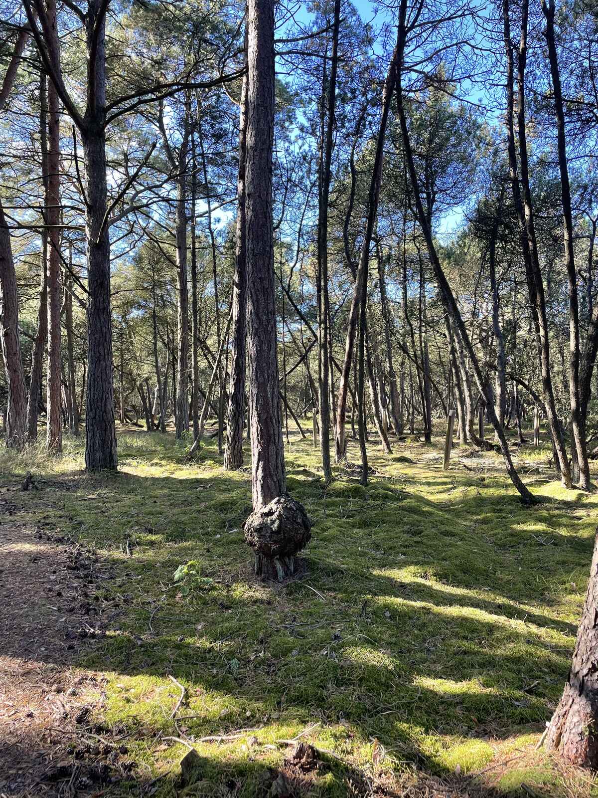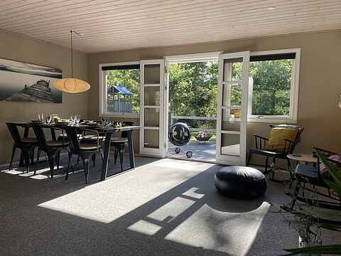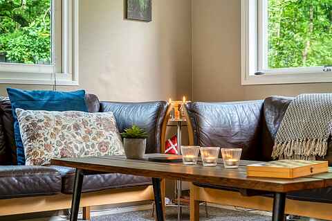 Fra stuen og terrassen er der udsigt over skoven, hvor stier fører jer rundt i områdets varierede terræn.