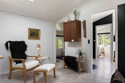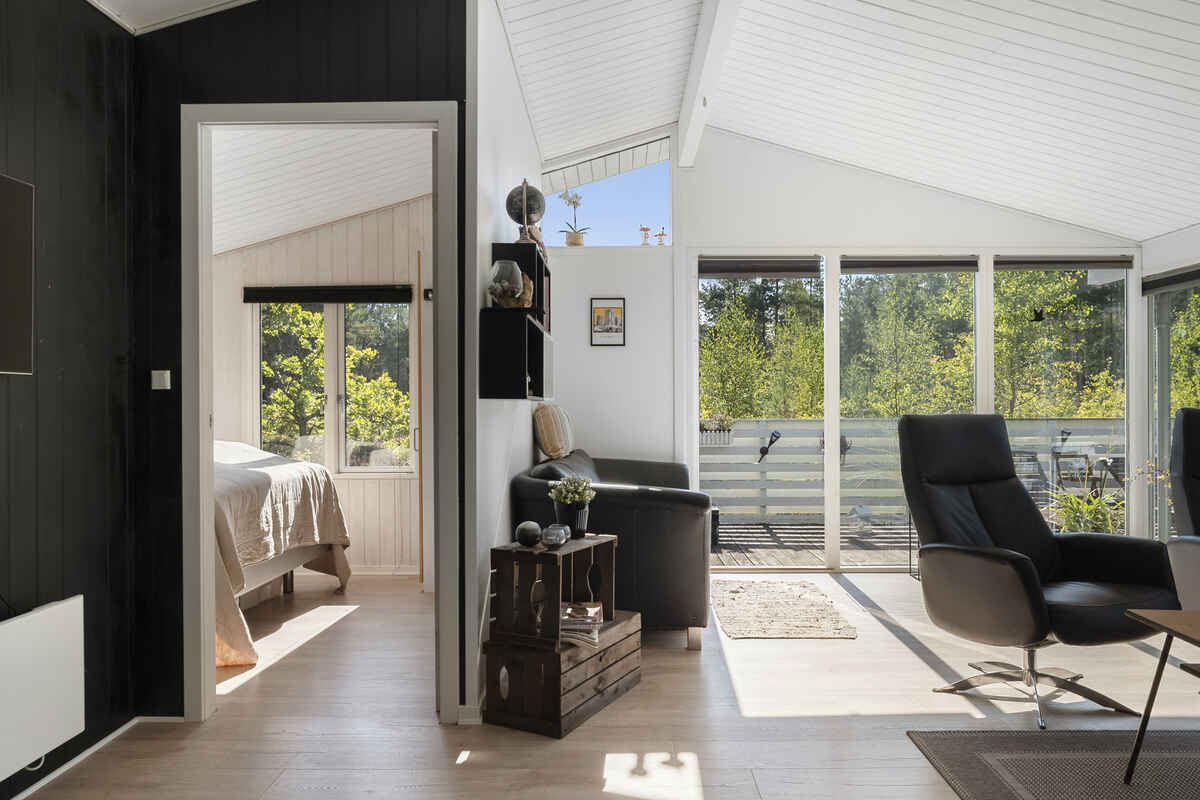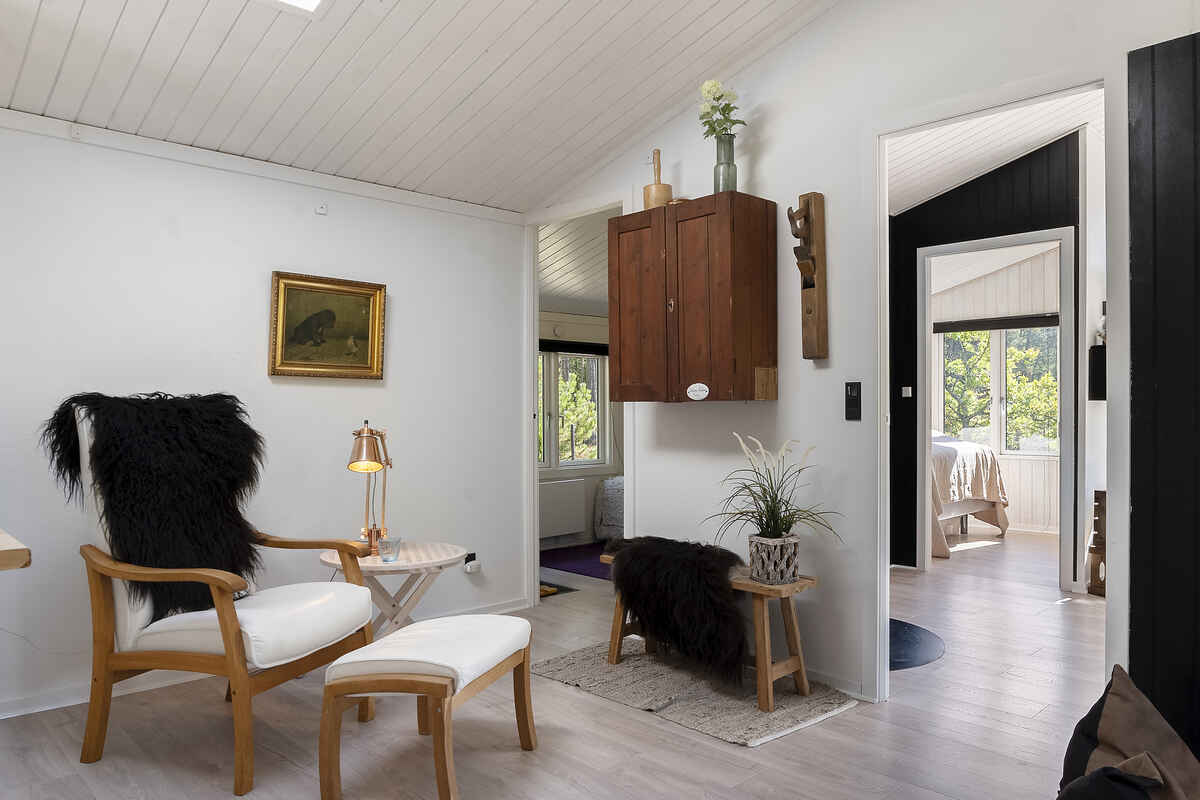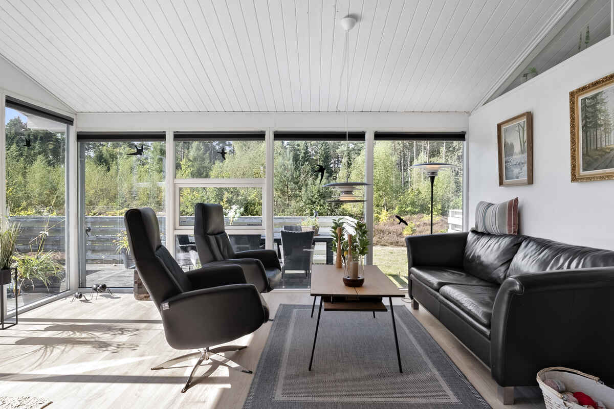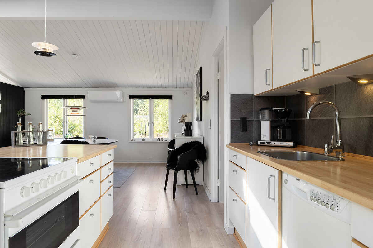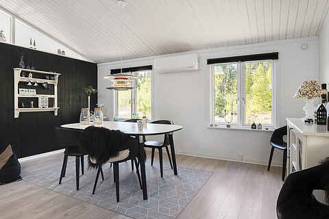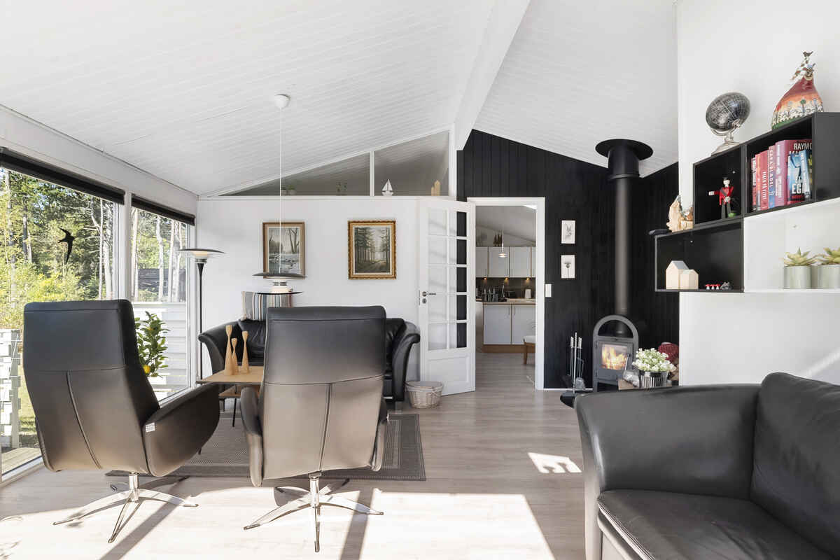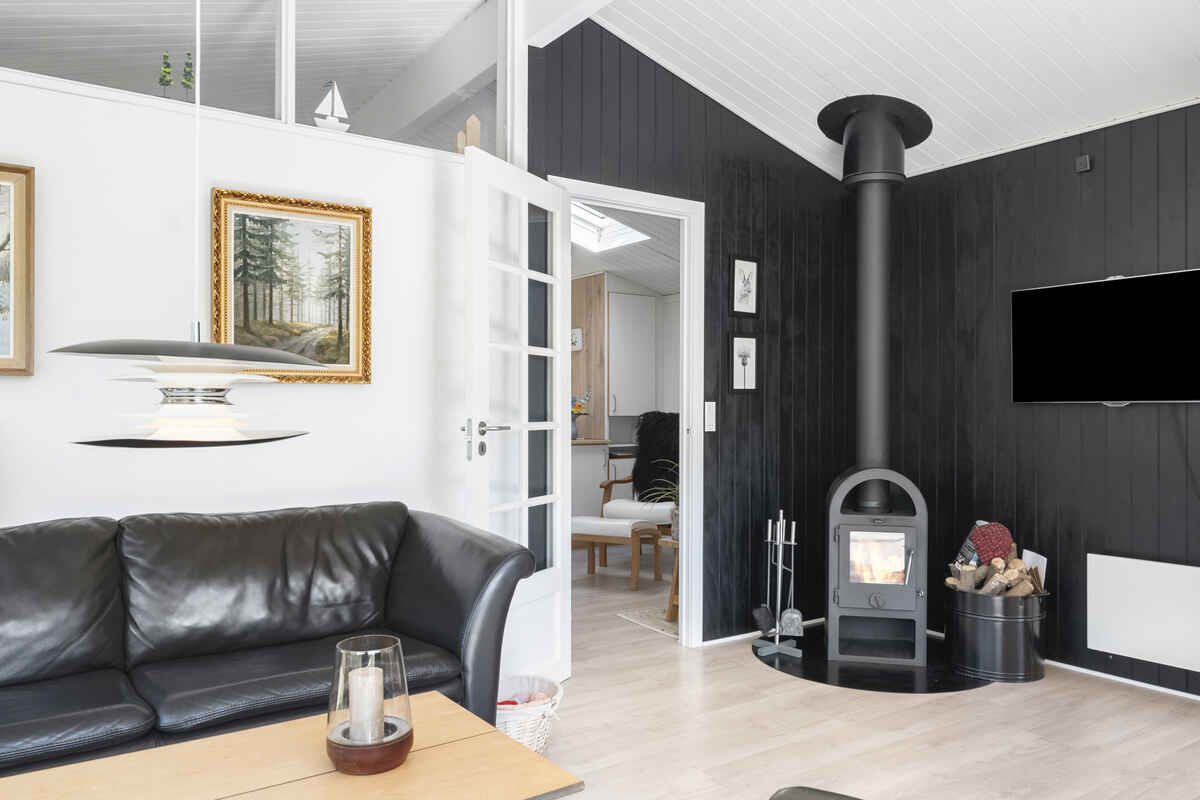 Den energivenlige varmepumpe sikrer et behageligt indeklima året rundt, og brændeovnen bidrager med ekstra varme og ægte sommerhushygge på køligere dage.