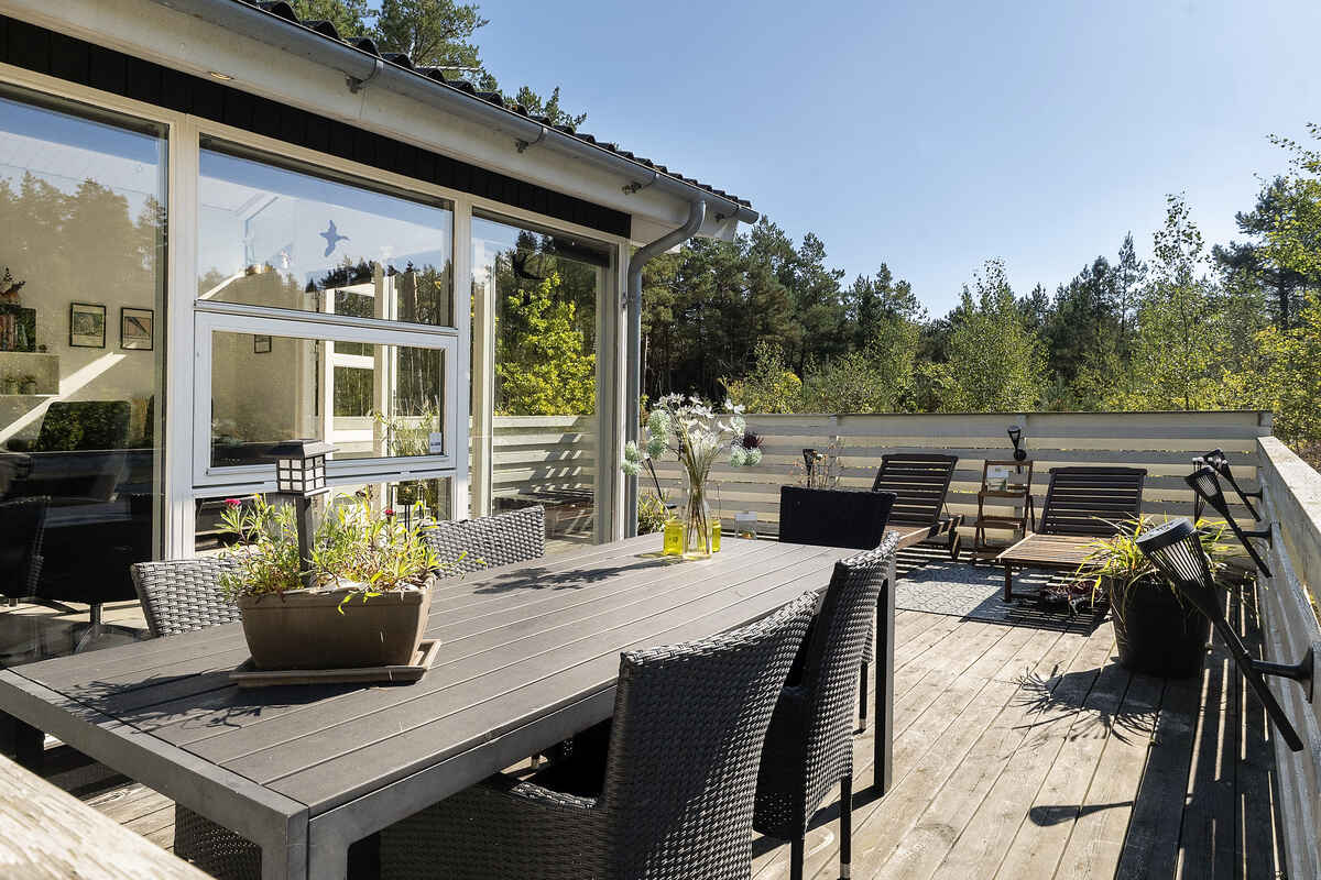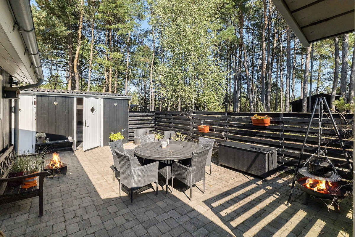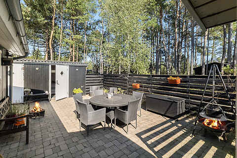 Udendørs venter en skøn naturgrund og flere terrasser, hvor I kan nyde morgenkaffen i solen, slappe af med en god bog eller tænde grillen om aftenen, mens dagen rundes af i ro og fred.