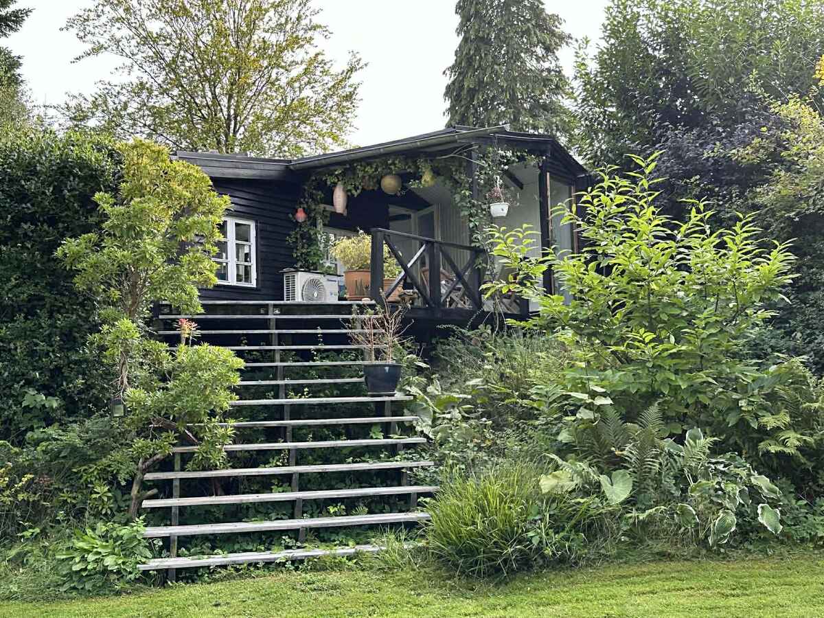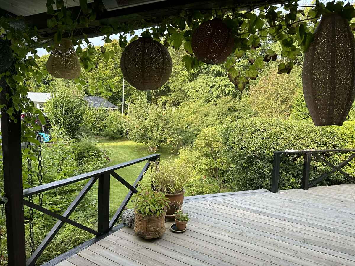 Sommerhuset ligger omgivet af skov og træer, med en stor, frodig og stemningsfuld have. Der er opsat en luksus udebruser og sauna med direkte udsigt til naturen, hvor man kan slappe af og nyde lyden af vinden i træerne og fuglesang.