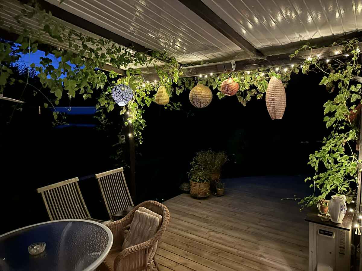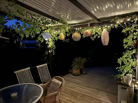 Huset er omkranset af en stor XL-terrasse med udsigt til fjorden og fuld privathed. Den overdækkede del af terrassen har et hyggeligt spiseområde med udekøkken, grill og terrassevarmer – perfekt til lange sommeraftener.