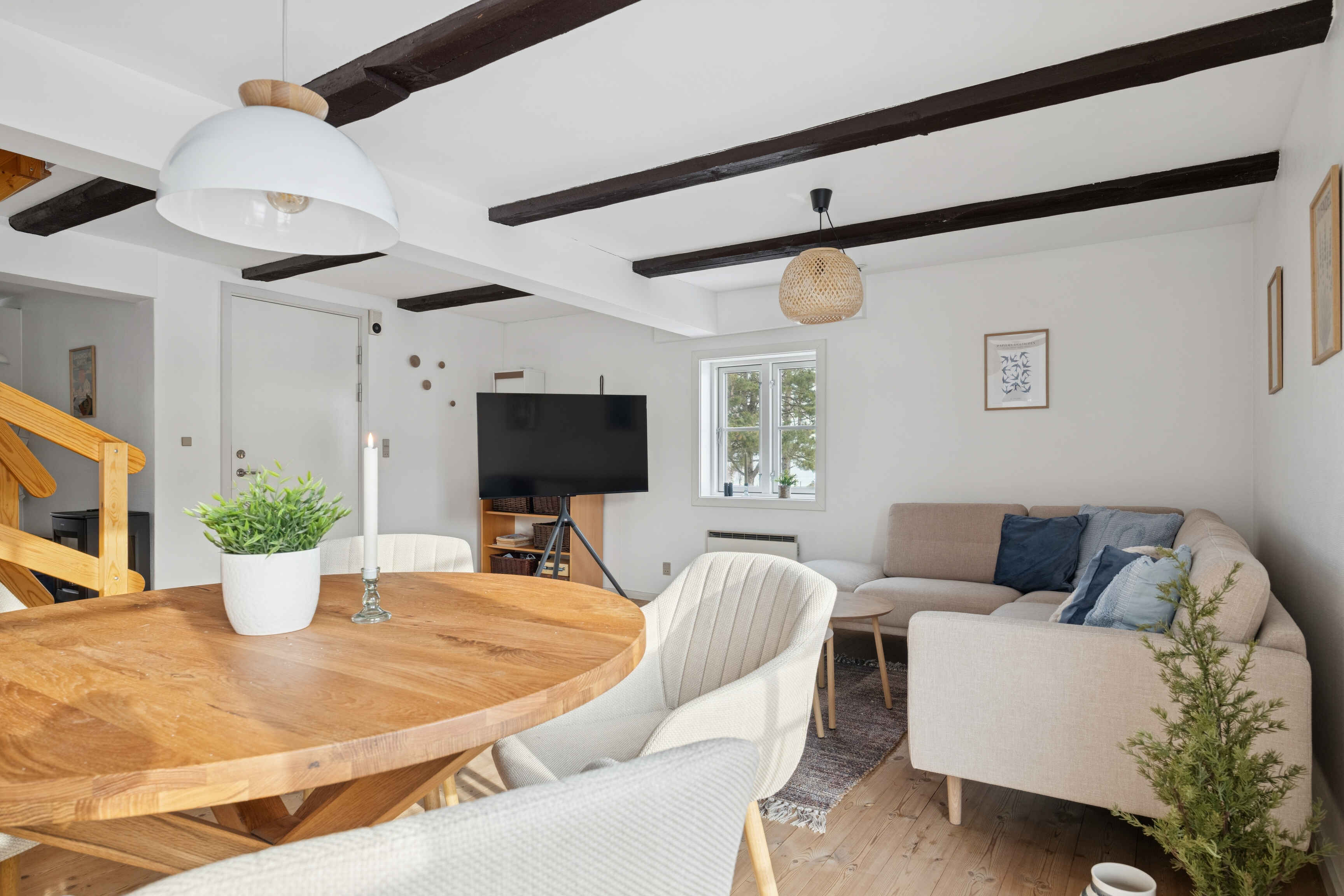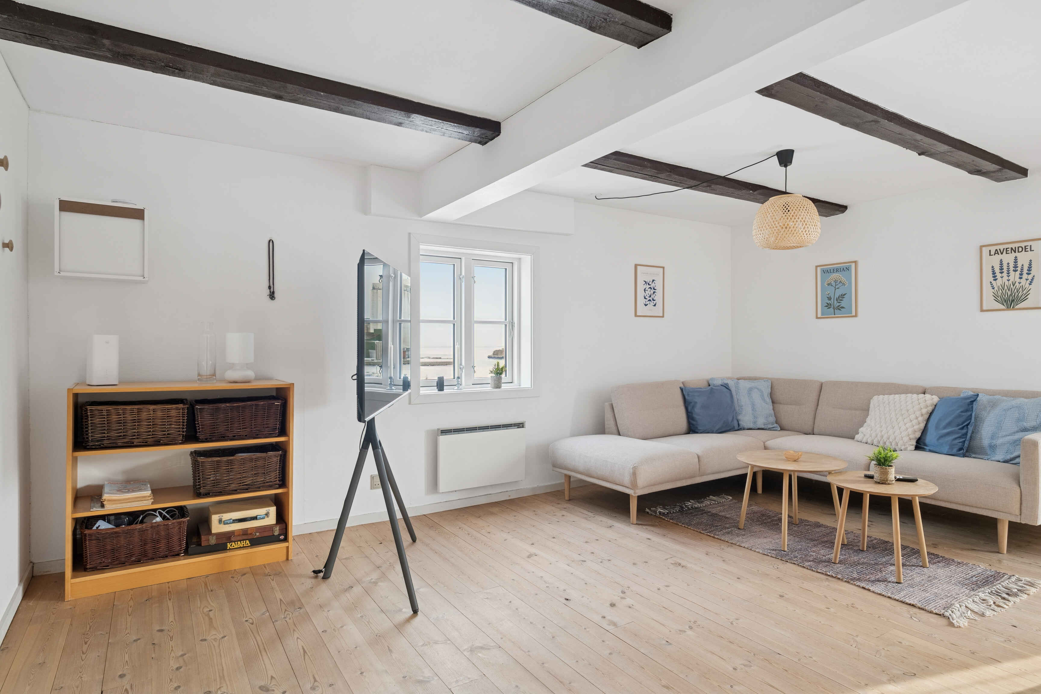 Boligen ligger på 2. 3. og 4. sal med et lyst og rummeligt opholdsrum med udsigt til havnen og i åben forbindelse til køkken. Det runde spisebord og sofagruppe har god plads op til 6 personer – Smart-tv med Netflix. Køkkenet er fuldt fungerende køkken med komfur, emhætte, opvaskemaskine, køle/frys.