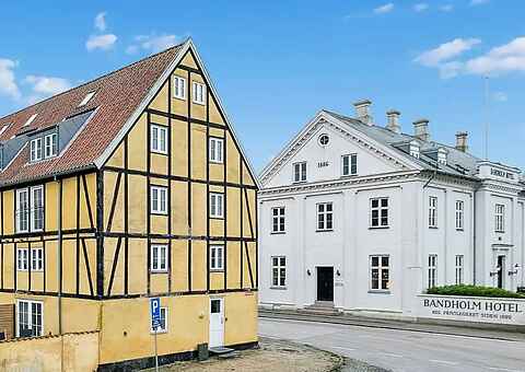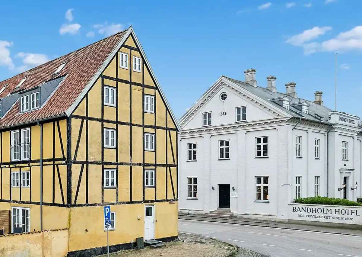Ferieboligen i Det Gule Pakhus ligger i hjertet af Bandholm – lige over for det ikoniske Bandholm Badehotel,