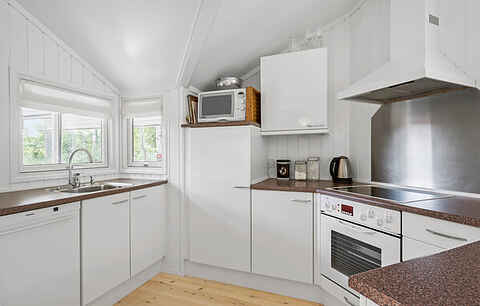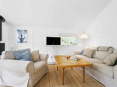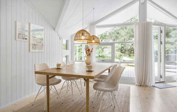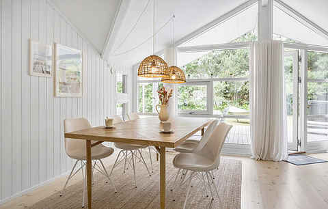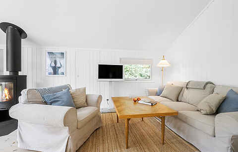 Sommerhuset er lyst og indbydende med store vinduespartier, der giver et smukt lysindfald og skaber en varm og behagelig atmosfære. Den hyggelige opholdsstue er indrettet med komfortable møbler og brændeovn, hvilket gør huset ideelt både til sommerferie og ophold i de køligere årstider.
