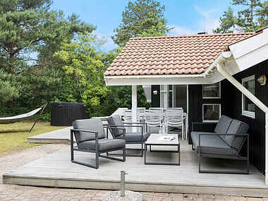 Fra stuen er der direkte adgang til en stor, åben terrasse med gode havemøbler. Her kan dagens måltider nydes i solen, mens de lange sommeraftener giver plads til afslapning og samvær. Den store have indbyder til leg, udendørsspil, solbadning og ro i grønne omgivelser.
