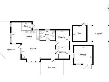 Huset rummer to soveværelser og en alkove med i alt seks sovepladser. Det ene værelse har en dobbeltseng, det andet har to enkeltsenge, og alkoven kan rumme yderligere to personer. Køkkenet giver gode forhold til madlavning og samvær og står i åben forbindelse med opholdsrum og udgang til terrassen.