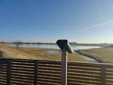 Den delvist overdækkede træterrasse er et naturligt samlingspunkt. Her kan udsigten nydes uforstyrret over engområde og en lille sø, hvor en sjældent ynglende lappedykker ofte ses. Terrassen indbyder til stille stunder, morgenkaffe eller fuglekiggeri med kikkert inden for rækkevidde.