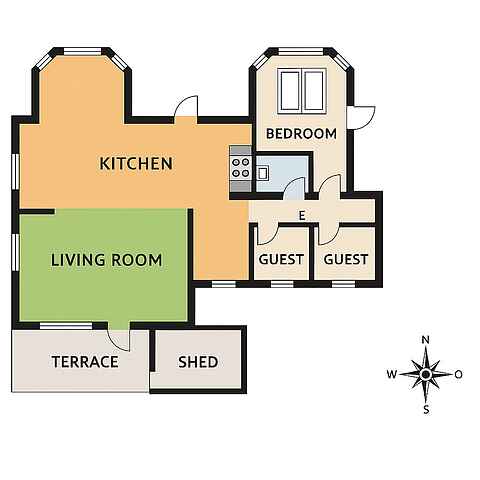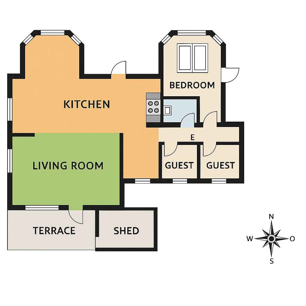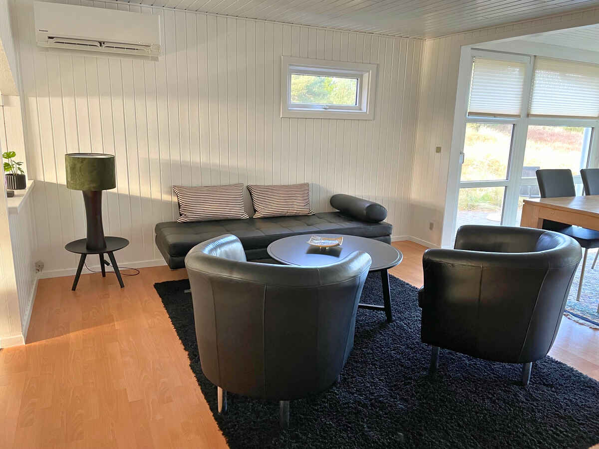 Træd ind i et lyst og indbydende sommerhus, hvor store karnapper lader dagslyset strømme ind og giver en skøn forbindelse til naturen udenfor. Det åbne, fuldt udstyrede køkken indbyder til fælles madlavning, mens spisepladsen danner rammen om hyggelige aftener med spil og samtaler. Indretningen emmer af komfort og ro – perfekt til afslapning året rundt.