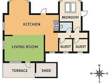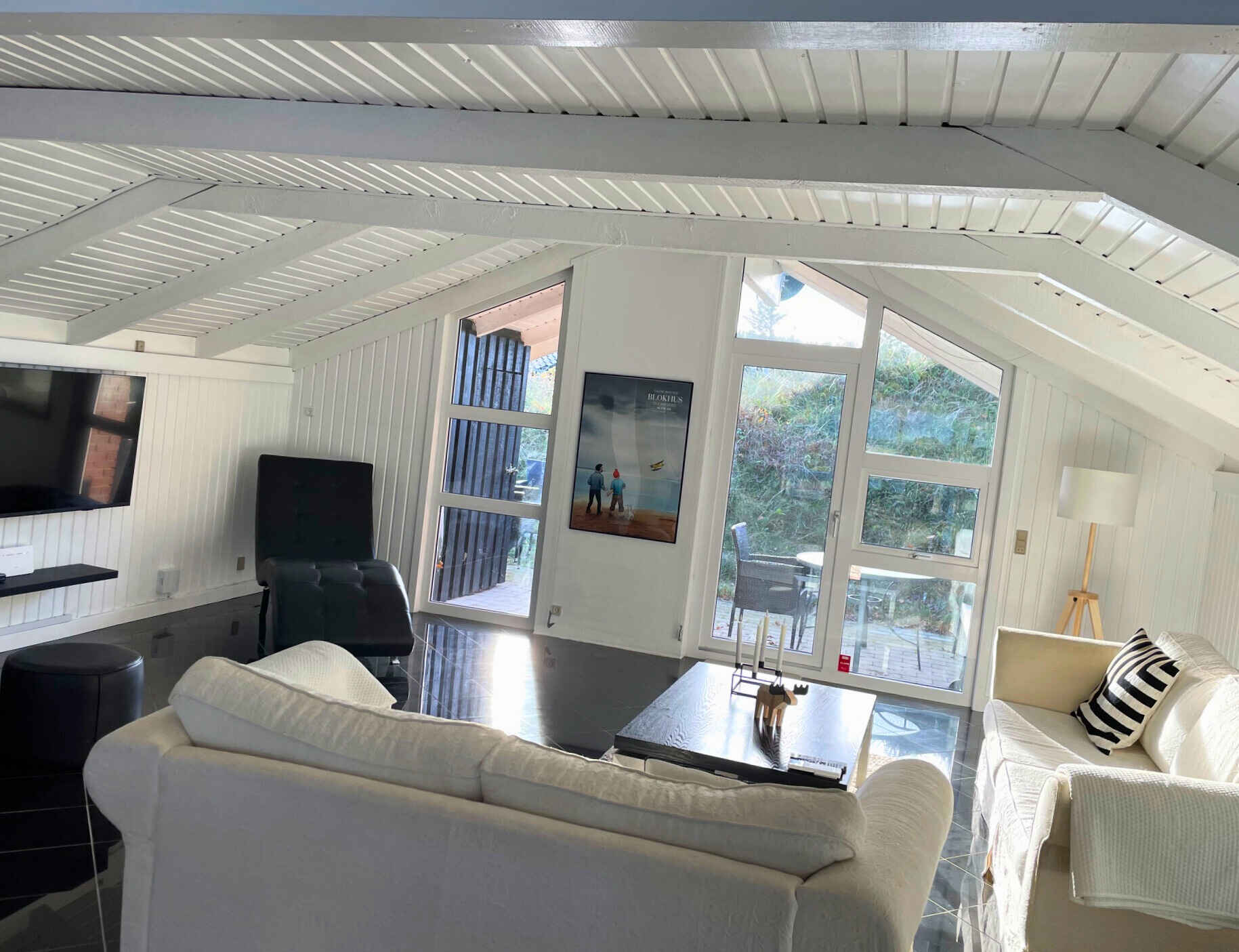 Træd ind i et lyst og indbydende sommerhus, hvor store karnapper lader dagslyset strømme ind og giver en skøn forbindelse til naturen udenfor. Det åbne, fuldt udstyrede køkken indbyder til fælles madlavning, mens spisepladsen danner rammen om hyggelige aftener med spil og samtaler. Indretningen emmer af komfort og ro – perfekt til afslapning året rundt.