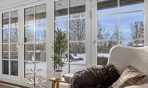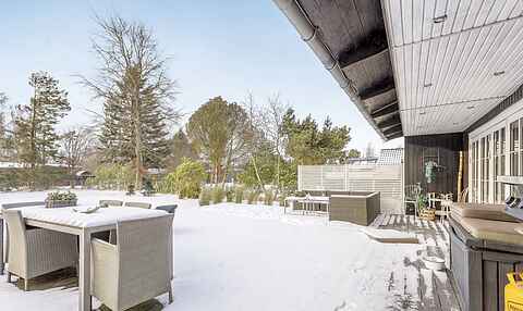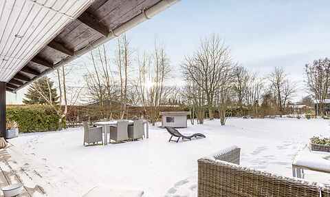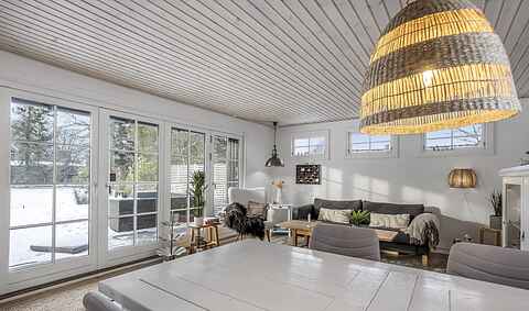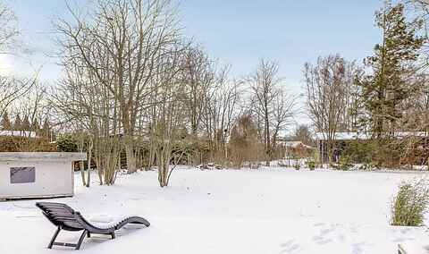 Fra stuen er der direkte adgang til en fantastisk stor træterrasse på hele 90 m² og videre ud til en stor, privat og indhegnet have. I haven finder du blandt andet en hyggelig shelter med mulighed for overnatning (luftmadrasser findes i huset) samt en lille bålplads. Alle terrassedørene i stuen kan åbnes helt op, så inde- og udeliv smelter sammen.