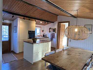 Boligens naturlige samlingspunkt er det åbne køkken-alrum med kogeø, hvor madlavning, måltider og samvær flyder sammen. Her er god kontakt til stuen, så alle kan være med – uanset om dagen står på spil, snak eller afslapning.