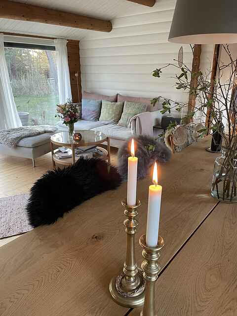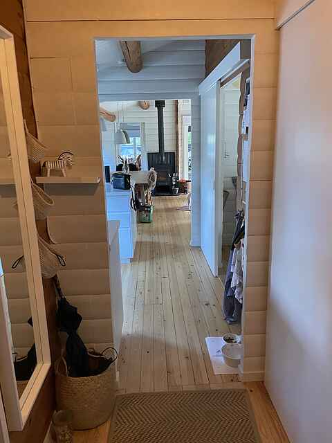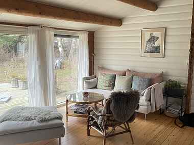 Sommerhuset rummer to soveværelser med dobbeltsenge samt et ekstra værelse med en praktisk slå‑ud‑seng. Opholdsrummet er hyggeligt og personligt indrettet, og brændeovnen bidrager til en særlig stemning på kølige aftener. Her er det nemt at læne sig tilbage, læse en bog eller nyde et glas vin efter en dag ved stranden.