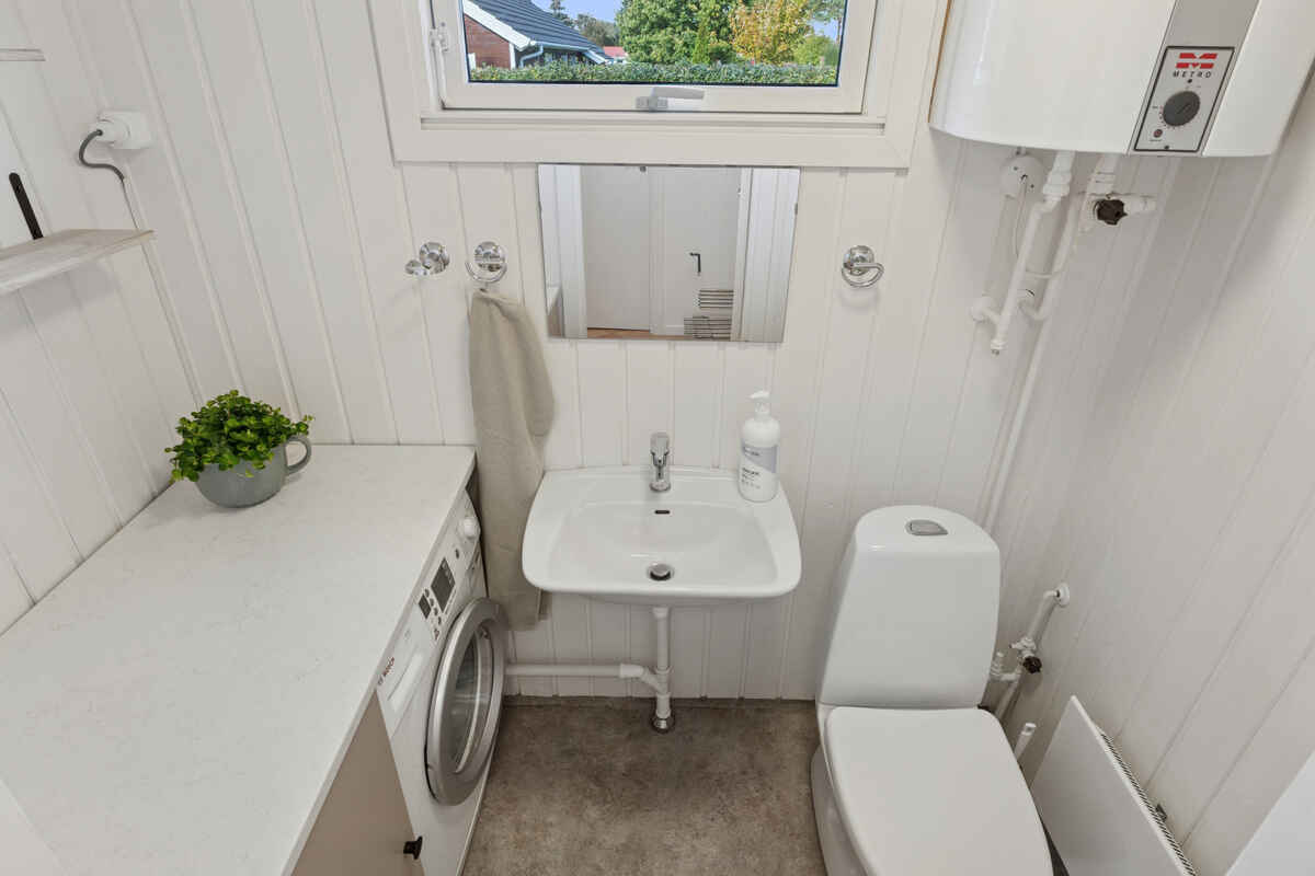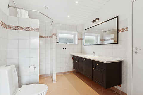 Der er stort badeværelse med gulvvarme, samt et gæstetoilet, hvor der er vaskemaskine.