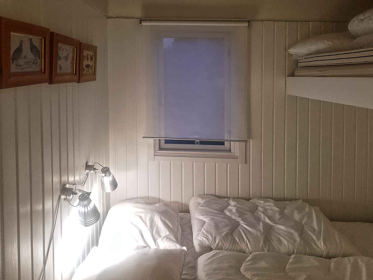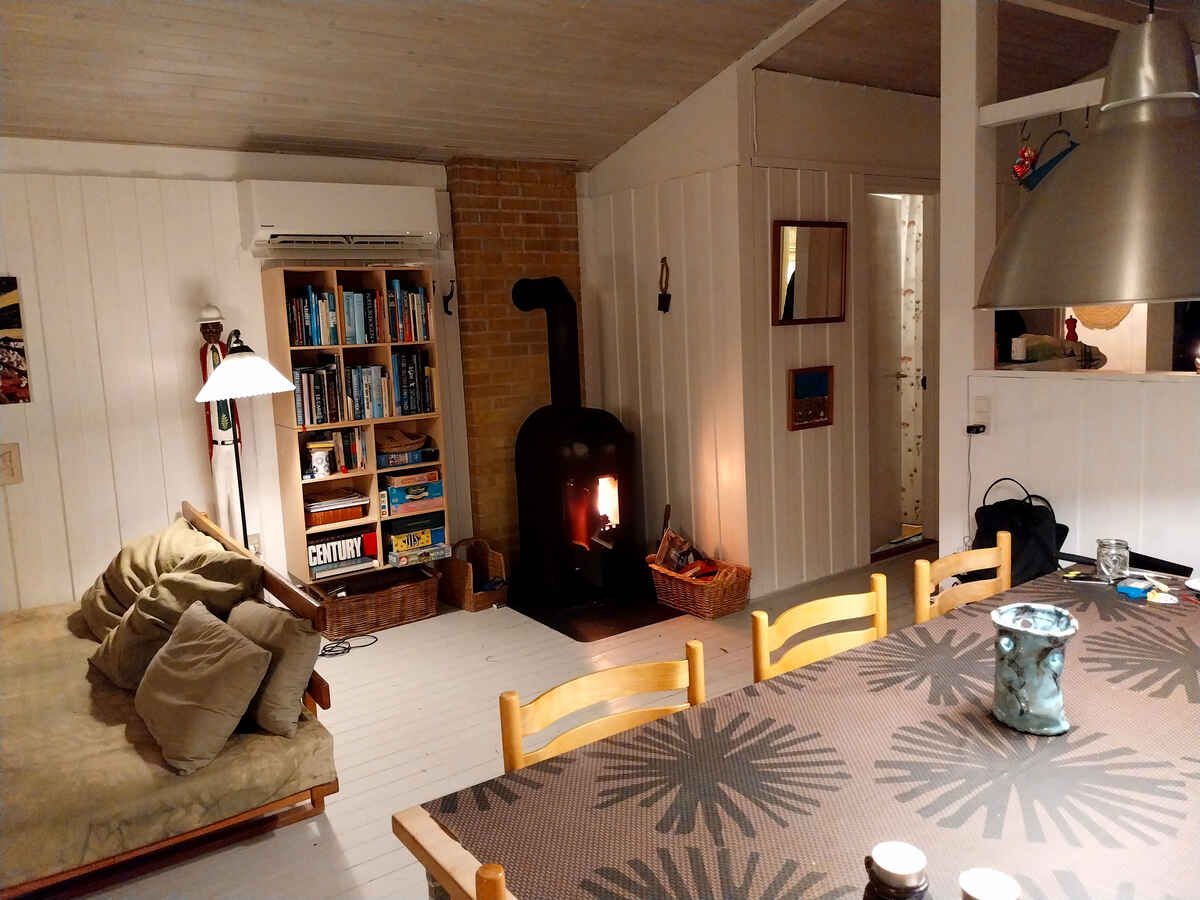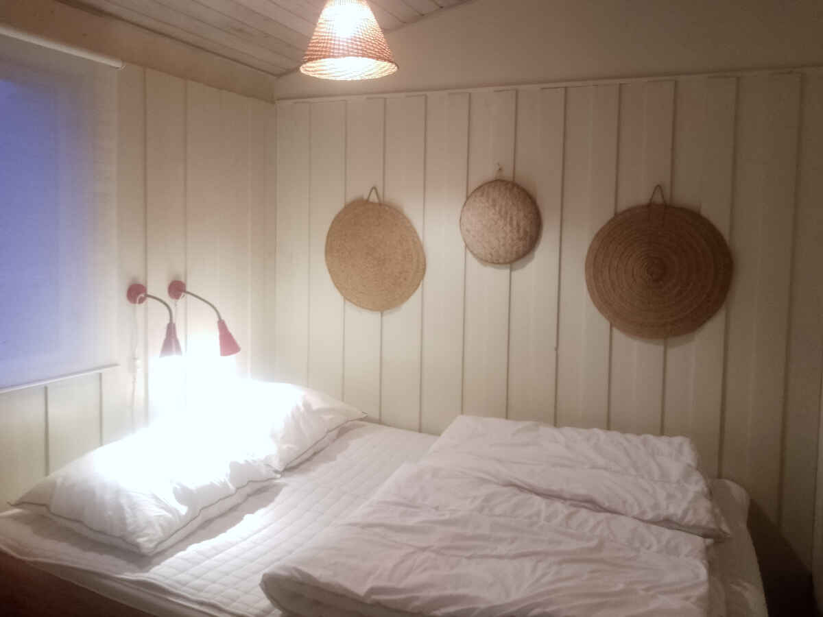 Indretningen er funktionel og overskuelig. Huset rummer to soveværelser med i alt fire sovepladser samt køkken og stue i åben forbindelse. Brændeovnen skaber en behagelig stemning på kølige dage og aftener.