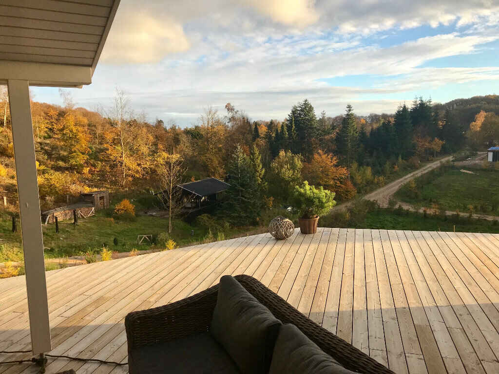 Der er flere terrasser udenfor, hvor man kan sidde og slappe af og nyde den helt unikke udsigt. På den åbne terrasse på 15 m2 er en markise med motordrev. I tilknytning til denne terrasse er der et shelter med plads til 4 personer. Der er naturligvis også havemøbler og en grill, et stort, flytbart bål-fad og en Morsø Pizzaovn. Har I har lyst til at overnatte ude og komme tættere på naturen, er der en shelter (helt tæt på huset) ved vest-terrassen med fin udsigt mod øst.