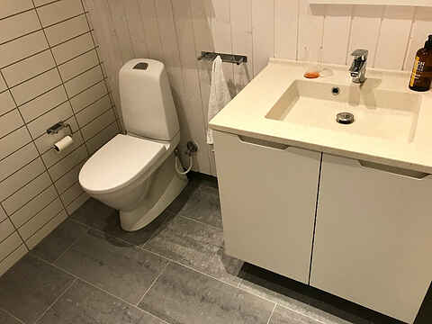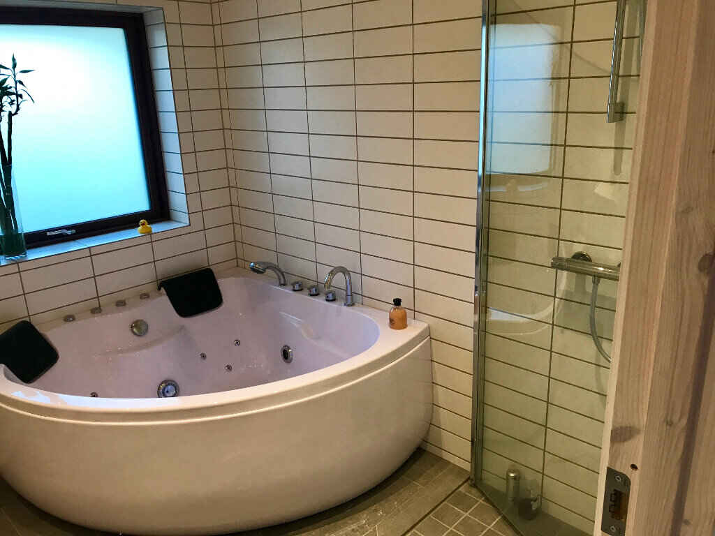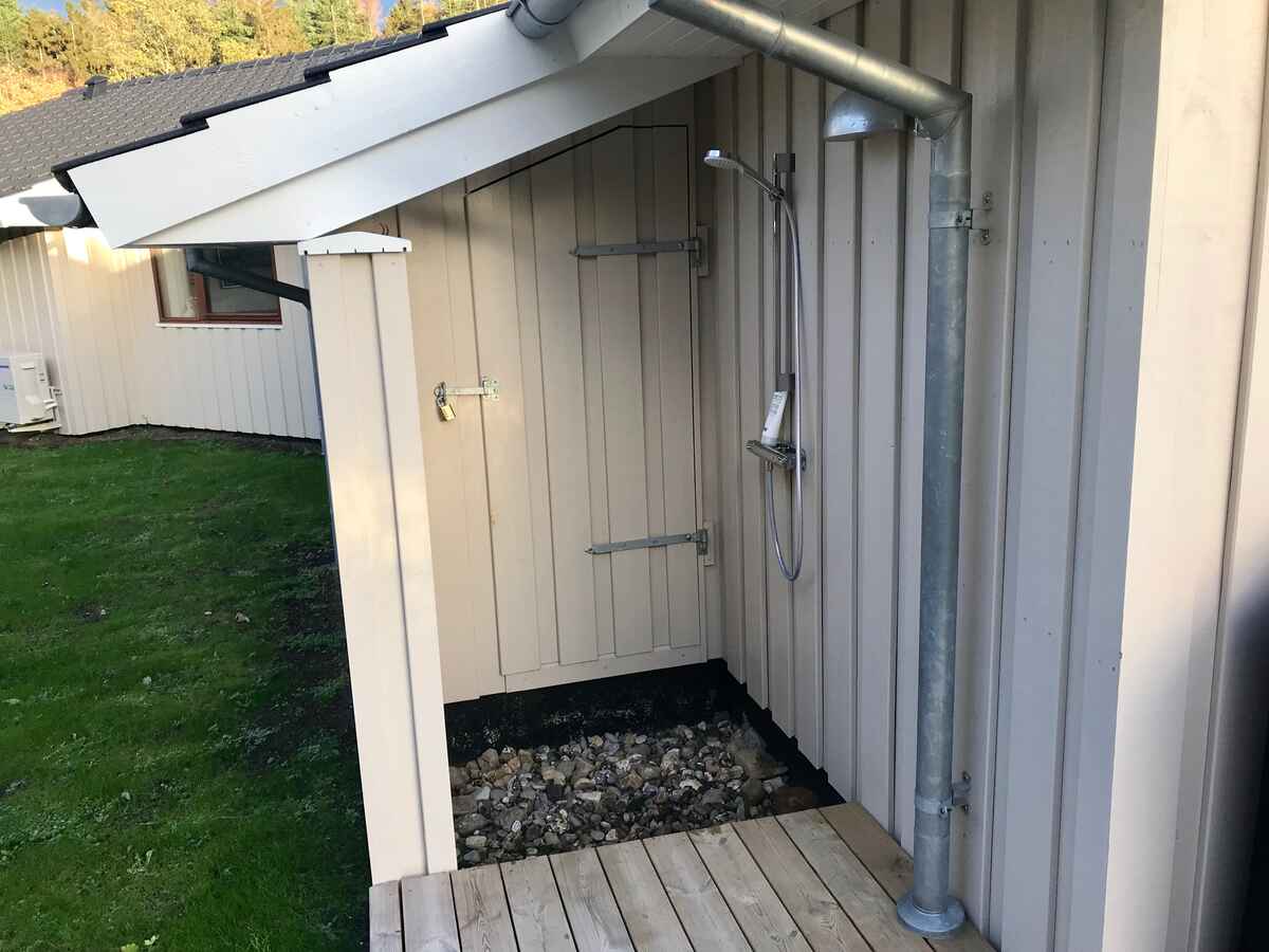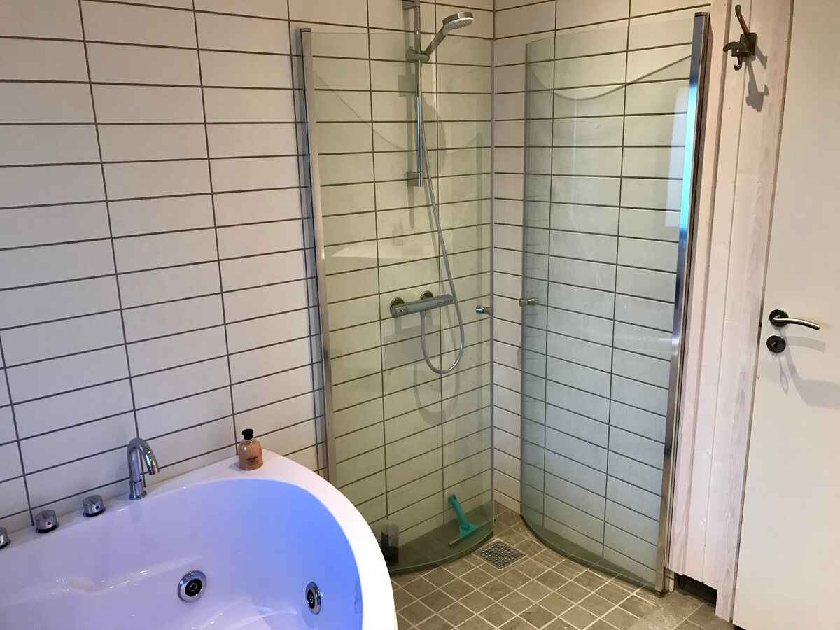 I huset er der to badeværelser med gulvvarme, og i det ene er der en to-personers spa, der giver mulighed for dejlig afslapning og samvær. Herudover er der en udendørs bruser, hvis du foretrækker at nyde den friske luft i kombination med dit brusebad.