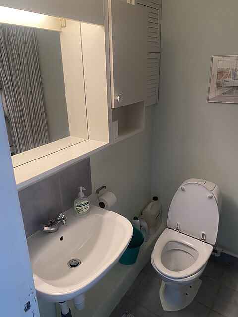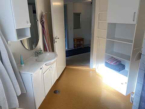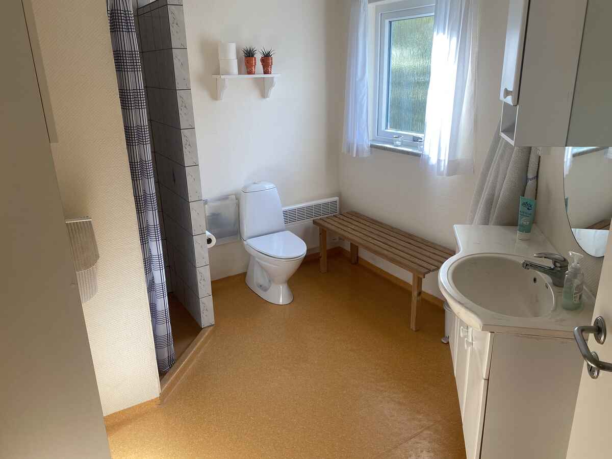 Der er et badeværelse med skabsmiljø, brusebad og toilet samt et ekstra toilet med håndvask. Her er også vaskemaskine og tørretumbler.