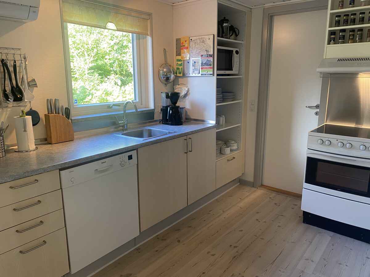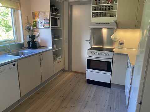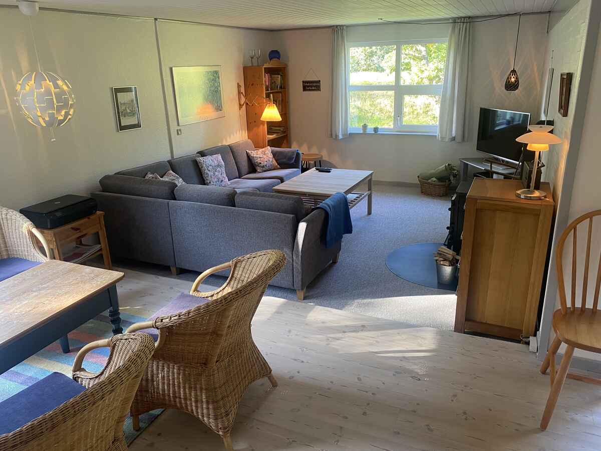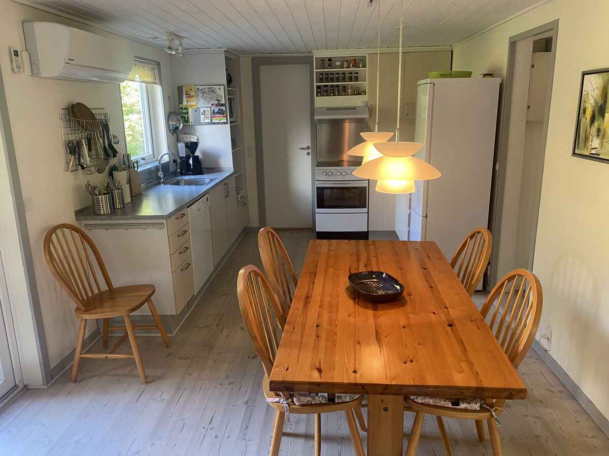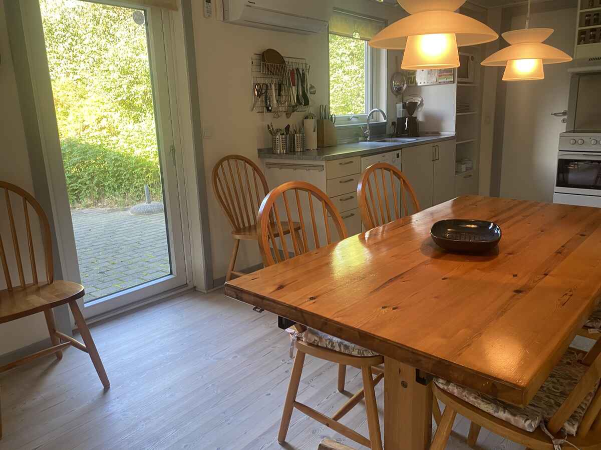 Huset har et dejligt køkken med opvaskemaskine i åben forbindelse med en praktisk spiseplads og med stuen, der er indrettet med en stor hjørnesofa, som familien kan hygge sig i foran fjernsynet. Skal der spilles brætspil, er der også et ”spillebord” med kurvestole omkring. Så kan familien være sammen, også selv om de laver forskellige aktiviteter. Der er brændeovn og også varmepumpe.