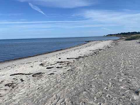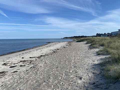 Den nærliggende strand er en rolig og børnevenlig sandstrand med små klitter og lav vanddybde. I området er der også gode cykelruter.