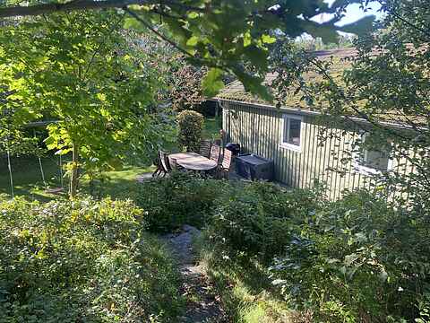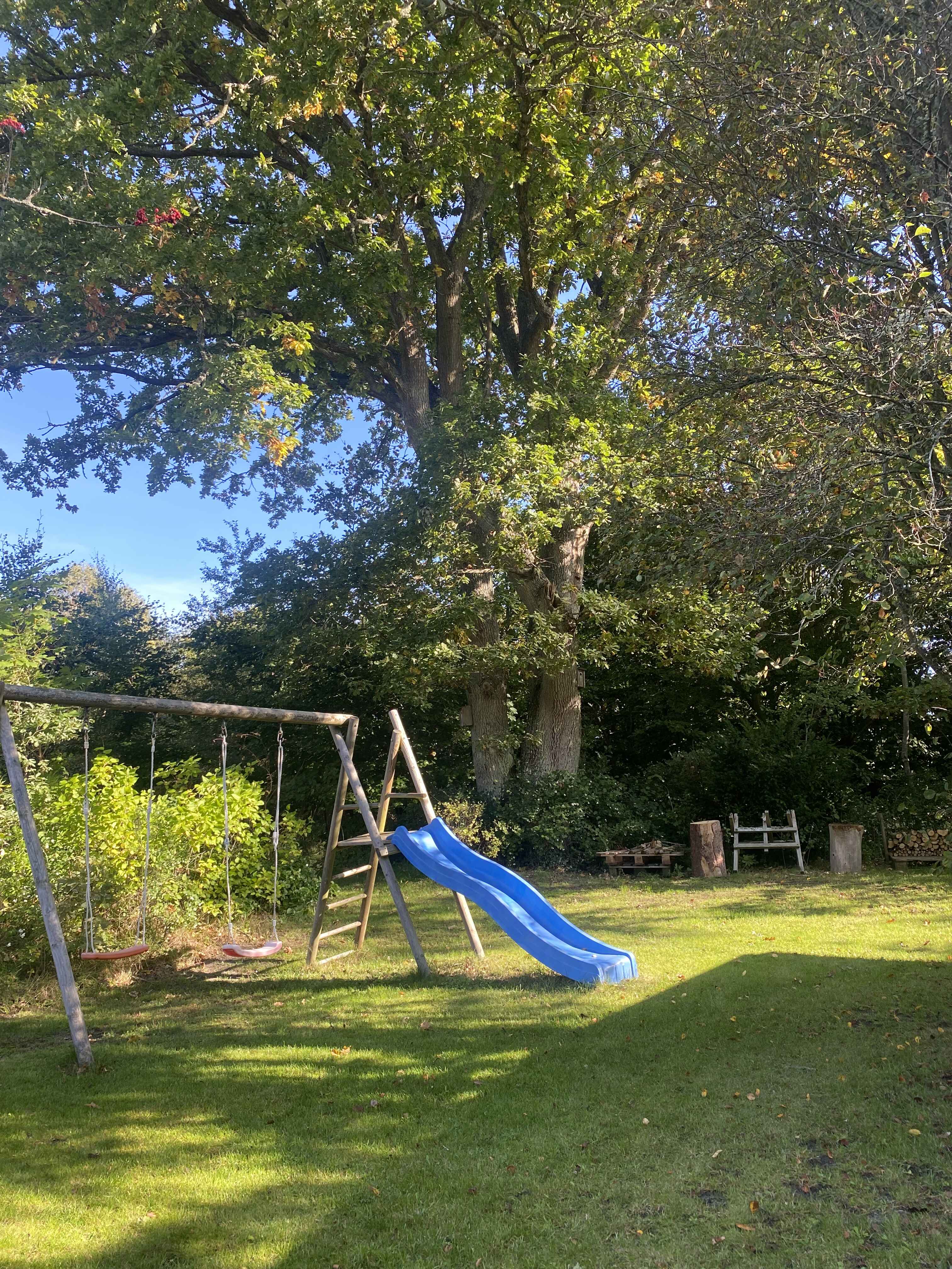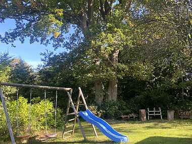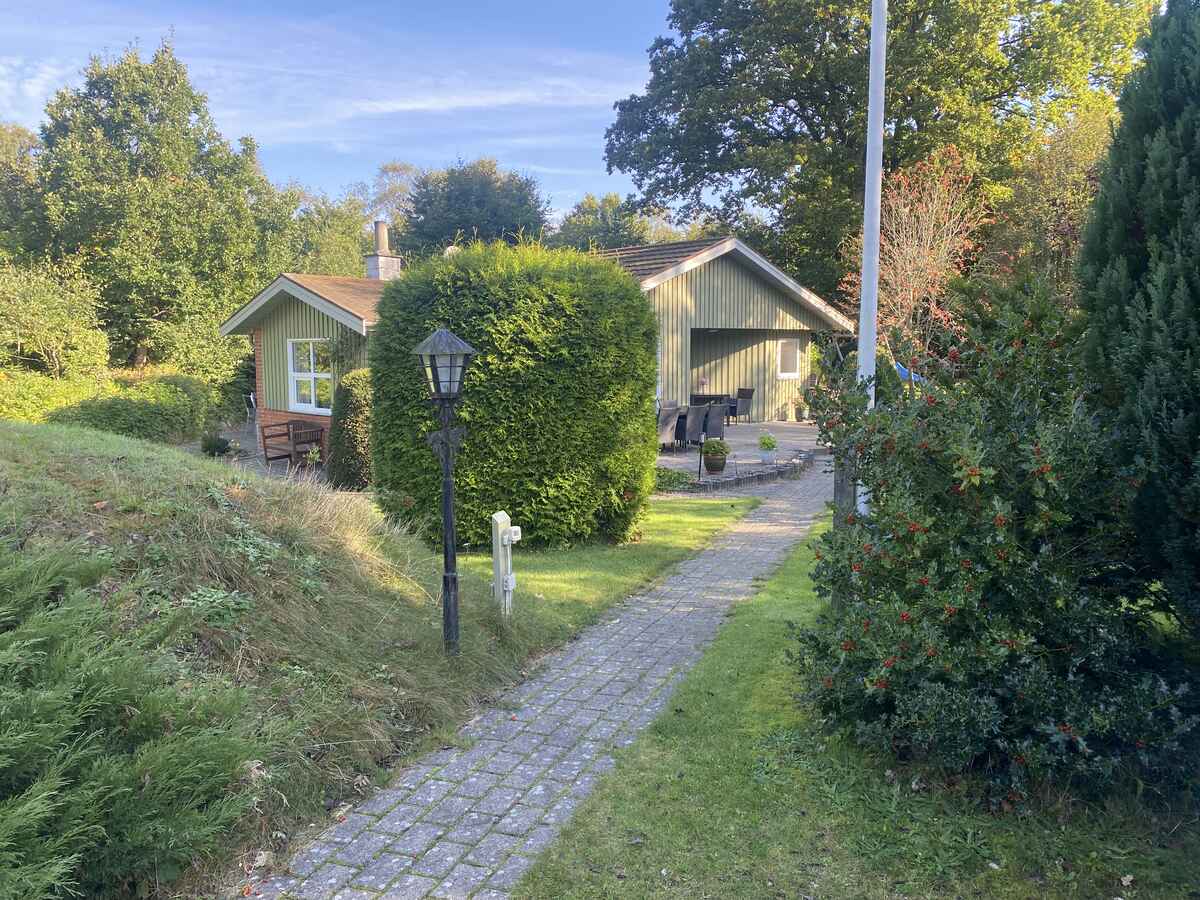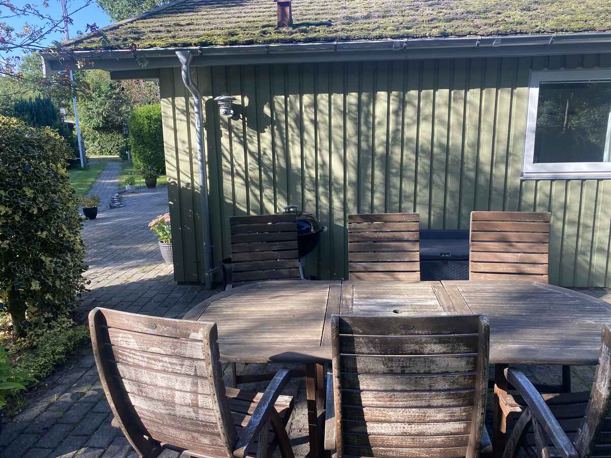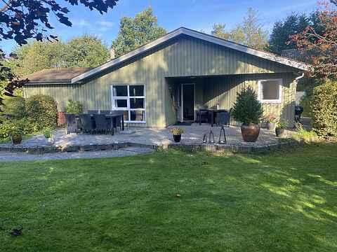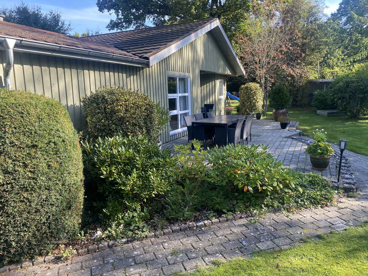 I haven står der et kæmpestort og smukt egetræ. Der er en skøn, stor åben terrasse med havemøbler, kulgrill, to liggestole og to sol-vogne. Der er også en overdækket terrasse, hvor man kan sidde og nyde den velholdte have, selv om solen måske ikke står højt på himlen.