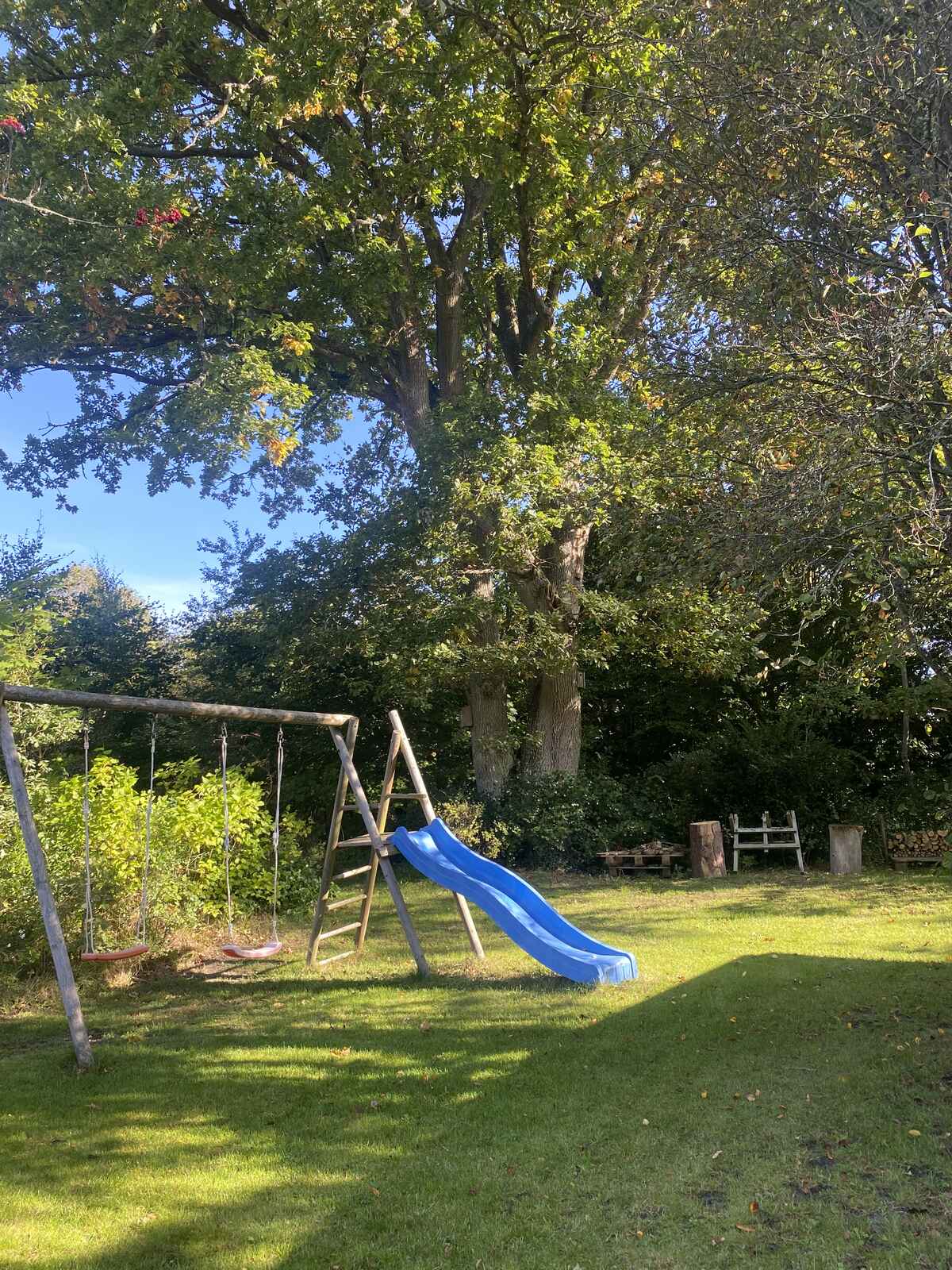 I haven står der et kæmpestort og smukt egetræ. Der er en skøn, stor åben terrasse med havemøbler, kulgrill, to liggestole og to sol-vogne. Der er også en overdækket terrasse, hvor man kan sidde og nyde den velholdte have, selv om solen måske ikke står højt på himlen.