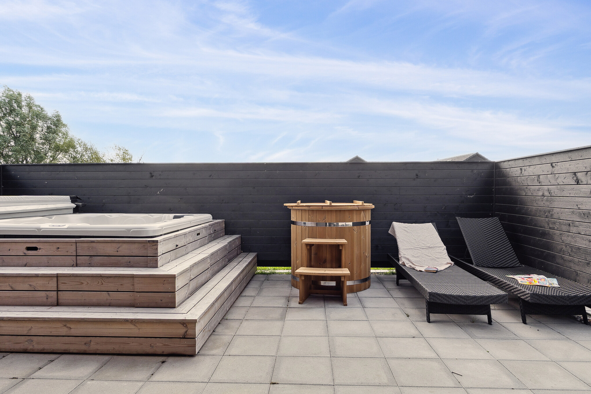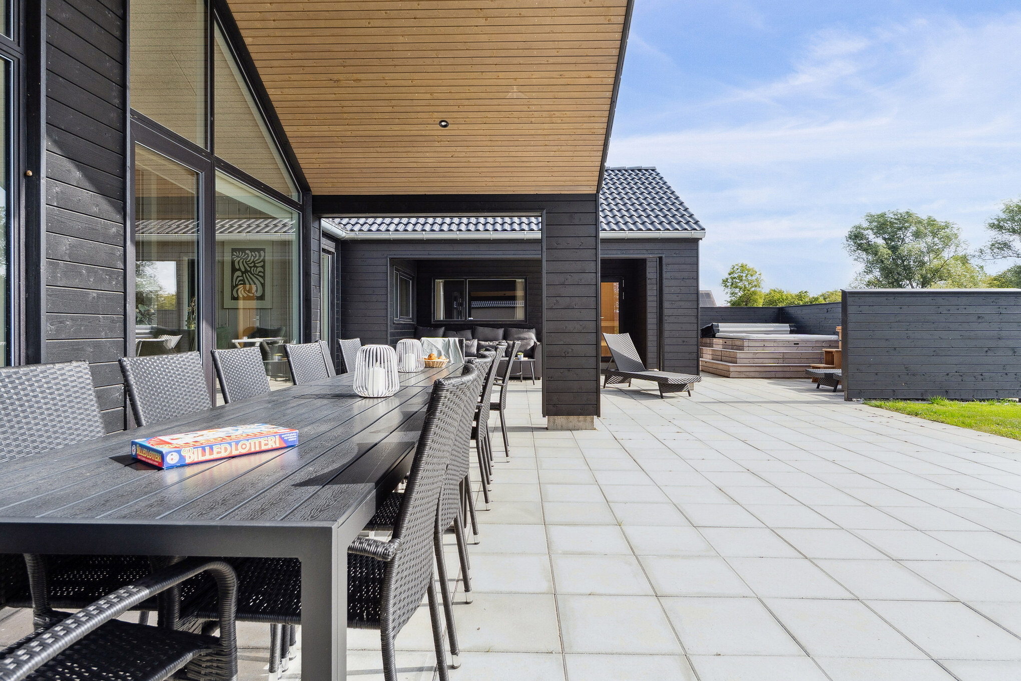Dette moderne sommerhus ved Hasmark Strand er ideelt for store familier med plads til 14 personer. Huset har en imponerende poolafdeling med vandrutsjebane og modstrømsanlæg, perfekt til sjov og motion. Indenfor finder I et stort fællesrum med åbent køkken, spisebord og brændeovn, samt direkte udsigt til poolen. Aktivitetsrummet byder på billard, bordtennis, dart og bordfodbold. Udenfor kan I nyde et udespa, sauna, bruser, og en delvist overdækket terrasse med havemøbler og to grill. Der er også en trampolin, gynge og legetårn for børnene. Sommerhuset tilbyder komfort og underholdning for alle aldre, samt en ladestik til elbil.
