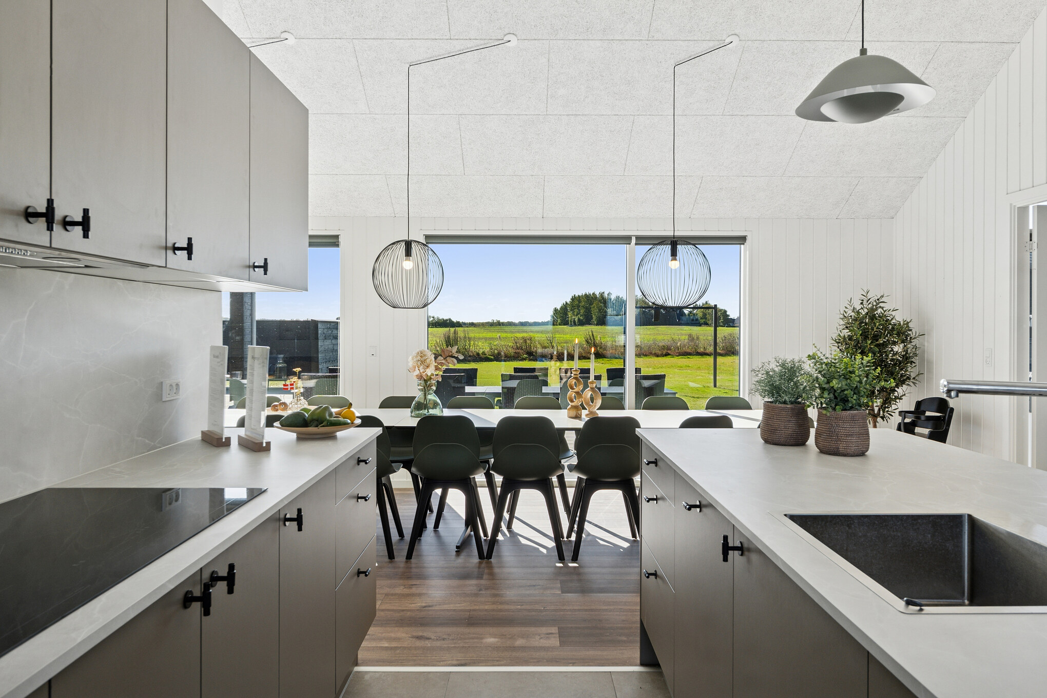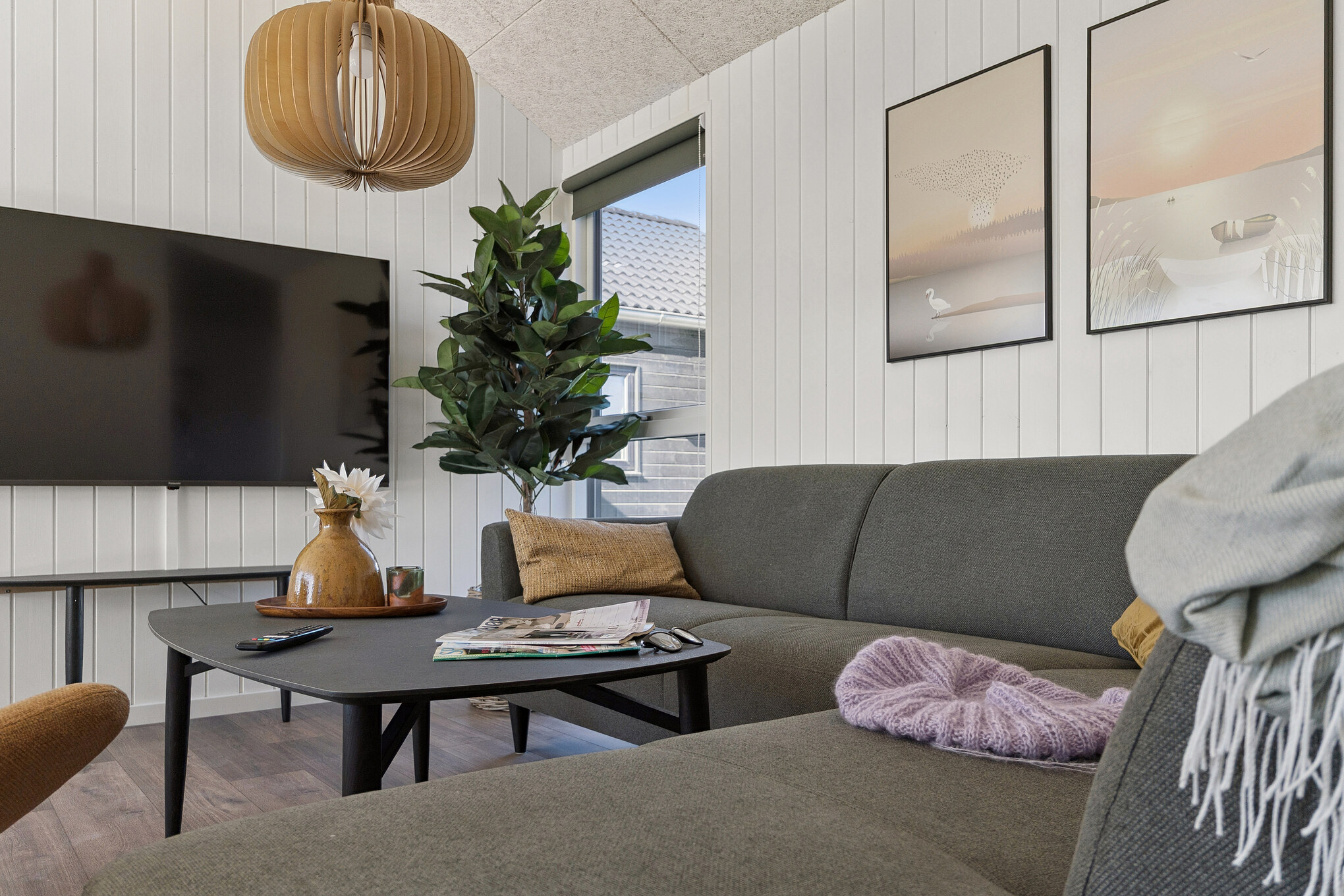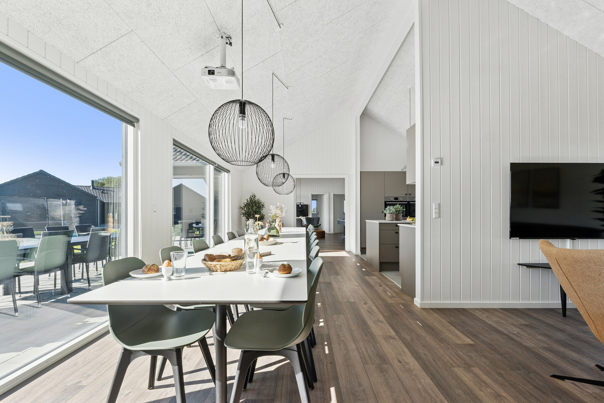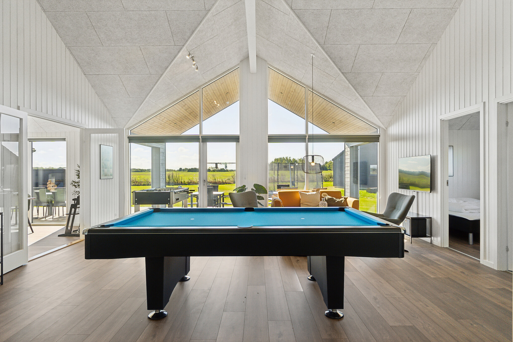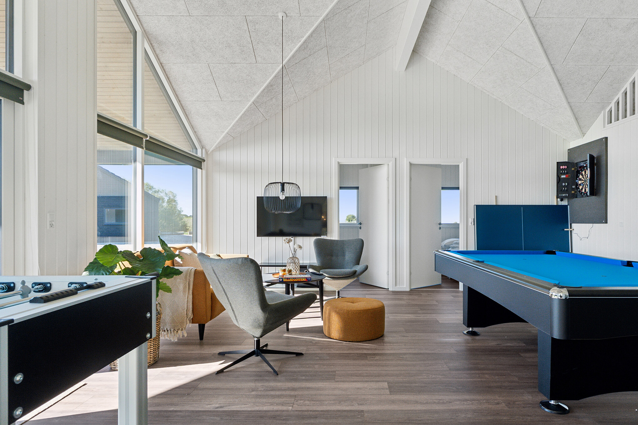 Dette moderne og rummelige Sammenhus™ nær Skåstrup Strand er ideelt til ferie med familie, venner eller kolleger. Med plads til op til 20 personer fordelt på 8 soveværelser, 4 hemsepladser og 4 badeværelser i to separate afdelinger, er der rig mulighed for både fællesskab og privatliv. Det store køkken-alrum med lang spiseplads og dobbelt køkkenudstyr danner rammen om hyggelige måltider, mens stuen med sofaer og brændeovn indbyder til afslapning. Huset er også velegnet til firmaarrangementer med projektor og lærred. Aktivitetsrummet byder på bordfodbold, bordtennis, dart og billard, og poolområdet med modstrømsanlæg og rutsjebane er populært blandt både børn og voksne. Udendørs findes spa, sauna, stor terrasse med grill samt trampolin og gynger i haven. Den korte gåtur til stranden og nærheden til hyggelige Bogense gør huset til det perfekte udgangspunkt for en afslappende og oplevelsesrig ferie året rundt.
