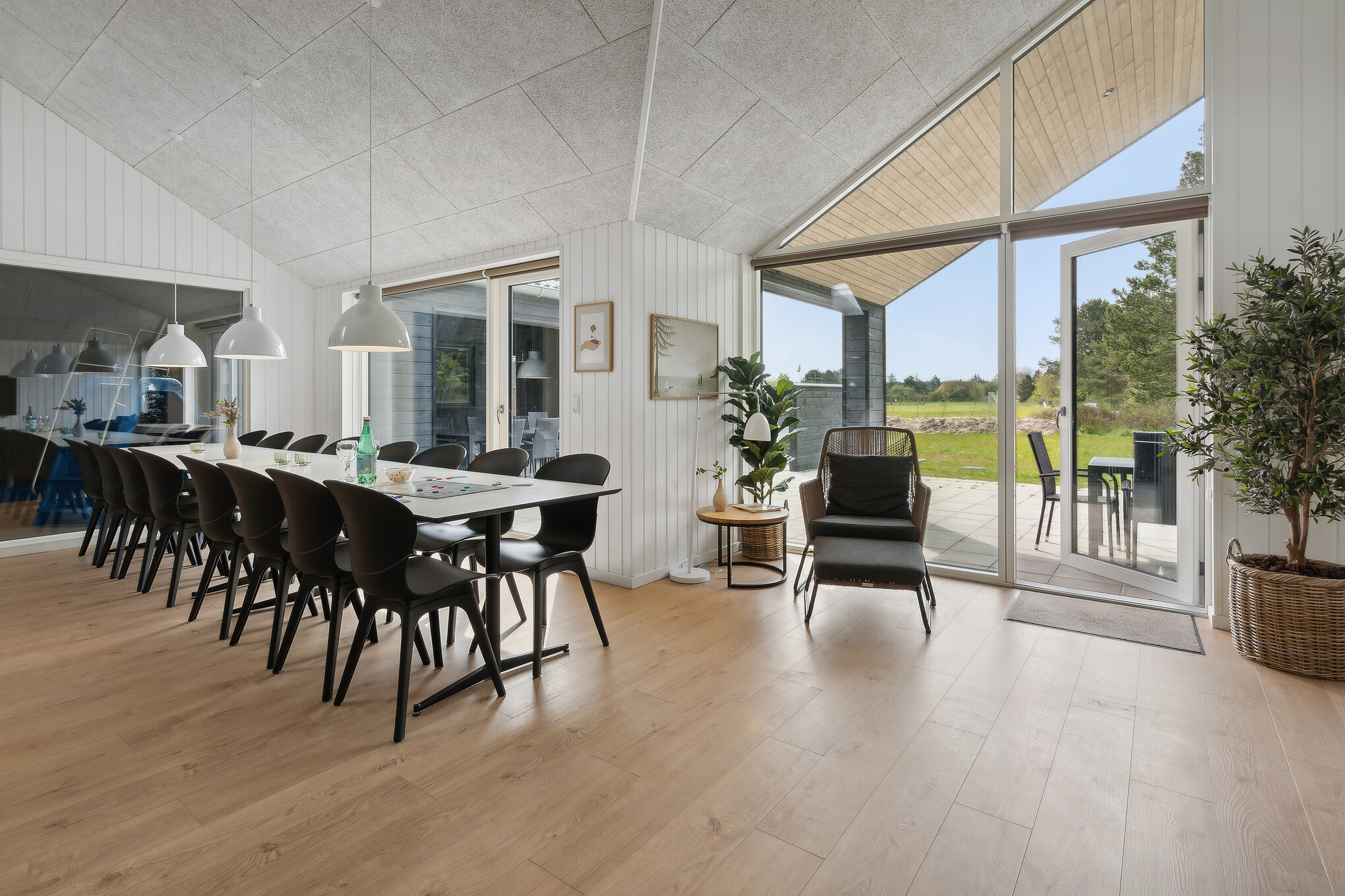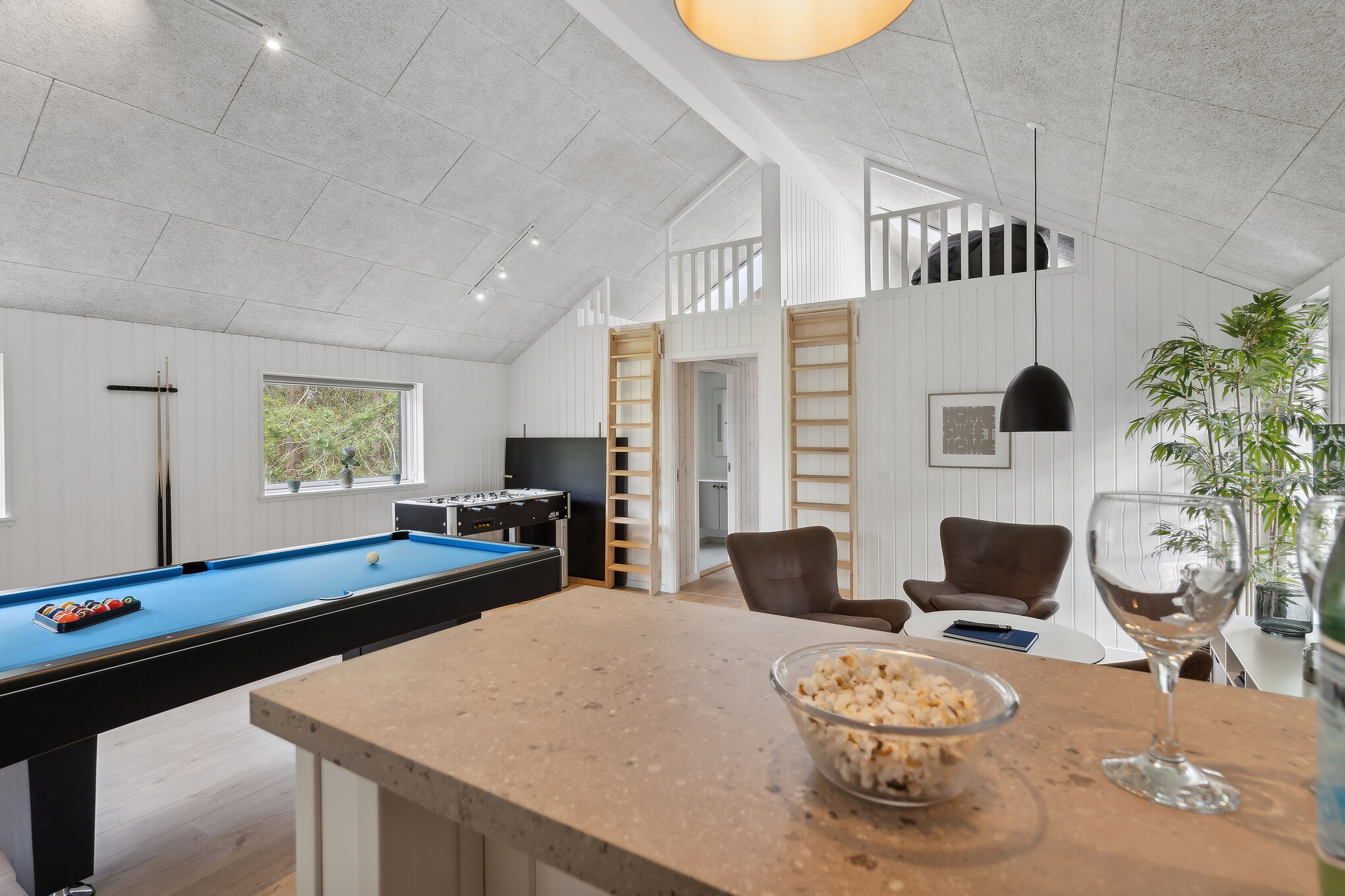Med havkig fra udespaen og kun 600 meter til stranden danner dette rummelige Sammenhus™ de perfekte rammer om ferie året rundt. Huset byder på indendørs pool med rutsjebane, stort aktivitetsrum med bl.a. billard, bordtennis, bordfodbold og PlayStation 5 samt en hyggelig opholdsafdeling, hvor køkken og stue samler alle til madlavning og samvær. Udendørs kan I nyde wellnessområde med spa, sauna og bruser samt en stor terrasse med grill og varmelamper. Haven har trampolin og gyngestativ til de yngste. Sovepladserne fordeler sig på 6 værelser og 4 pladser på hems, og med 3 badeværelser er komforten i top. Beliggende ved rolige og børnevenlige Skåstrup Strand tæt på Bogense.