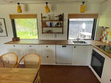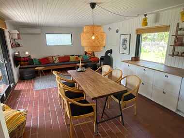 Indenfor forenes det rummelige, åbne køkken harmonisk med stuen, hvor brændeovnen skaber en varm og hyggelig atmosfære. Køkkenet er veludstyret med keramiske kogeplader, emhætte, køleskab med frostboks og en praktisk opvaskemaskine. I stuen finder du en lang indbygget sofa, et stort spisebord samt et Smart-TV med Chromecast, så du nemt kan streame dit yndlingsindhold. Gratis trådløst internet sikrer, at du kan holde kontakten med omverdenen.