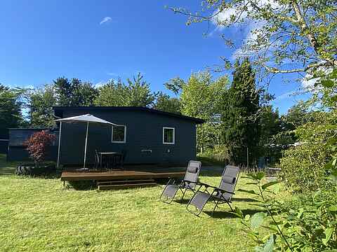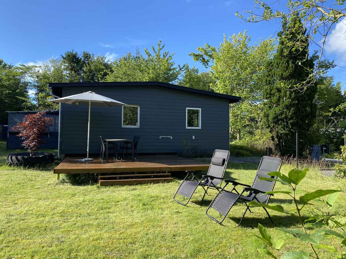 Udenfor er der en dejlig overdækket terrasse på 8 m2 og en stor åben terrasse på 24 m2. Der er grill, havemøbler og liggestole, så I kan slappe af og nyde den friske luft.