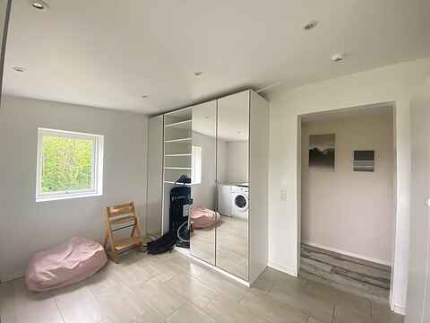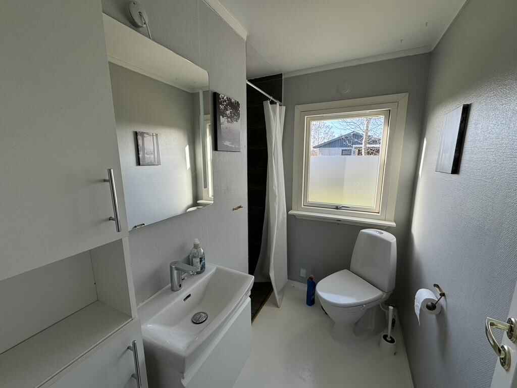 Badeværelse med skabe, brusebad, toilet og gulvvarme. Der er vaskemaskine og tørretumbler i huset.