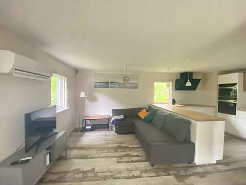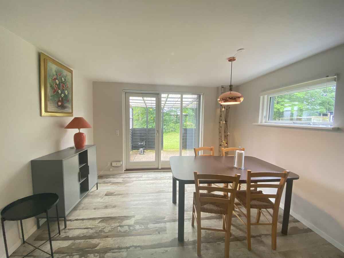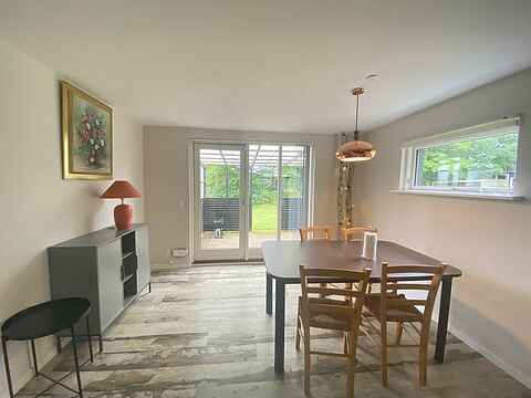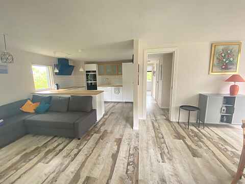 Husets dejlige køkken ligger i åben forbindelse med stuen. Køkkenet er nyindrettet med gode hårde hvidevarer og har både opvaskemaskine og mikrobølgeovn. I stuen er der Chromecast TV. Der er også en barnestol til rådighed. Fra spisepladsen er der døre ud til den overdækkede terrasse. Huset har varmepumpe.