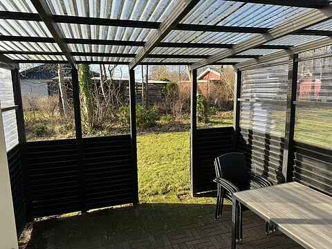 Udenfor er der en dejlig overdækket terrasse på 8 m2 og en stor åben terrasse på 24 m2. Der er grill, havemøbler og liggestole, så I kan slappe af og nyde den friske luft.
