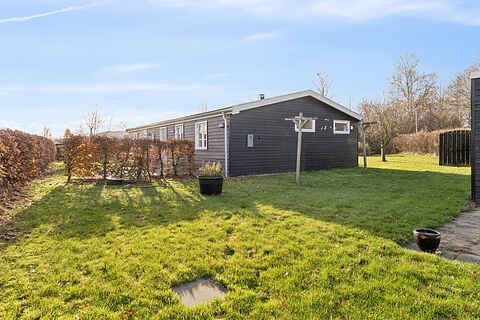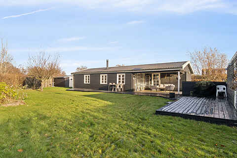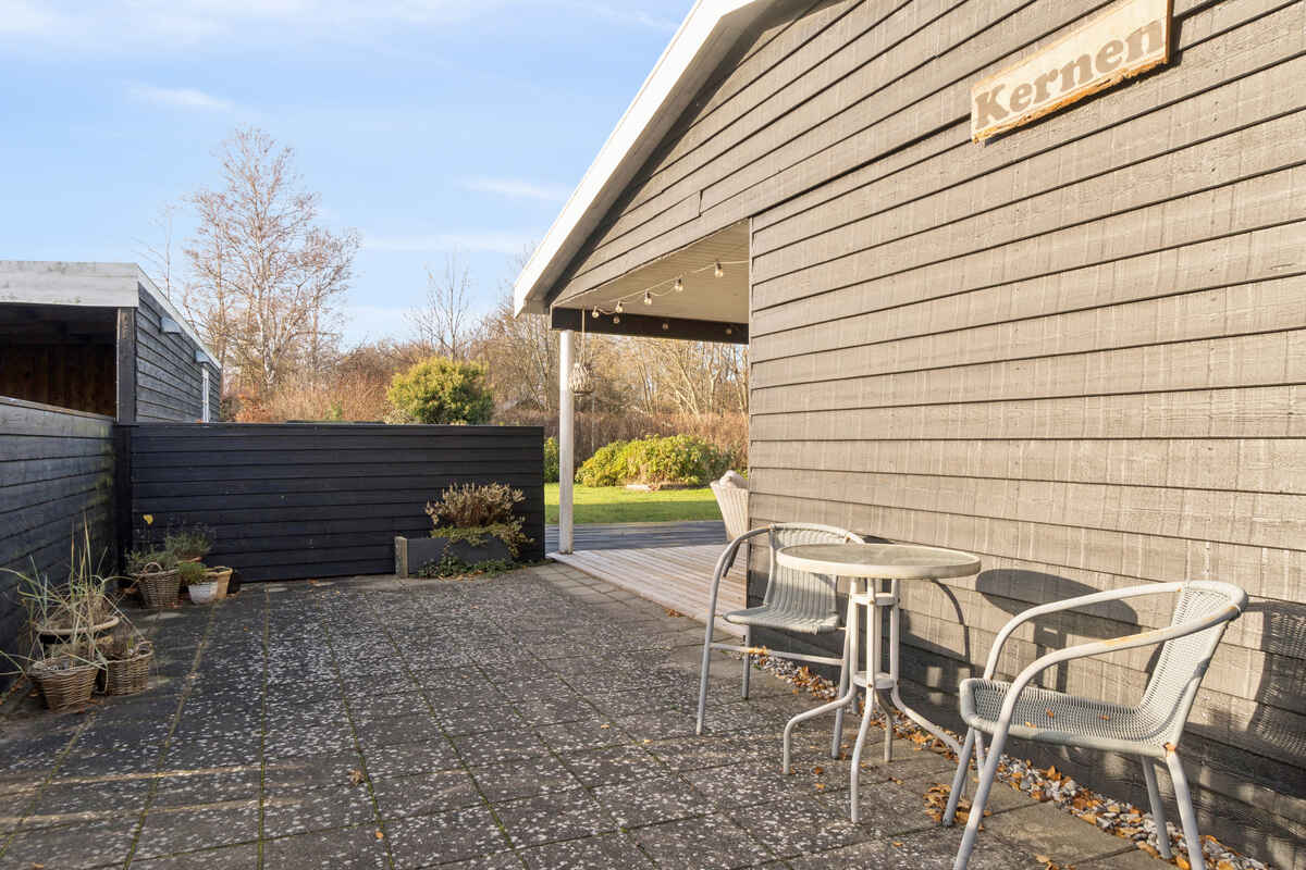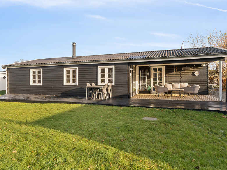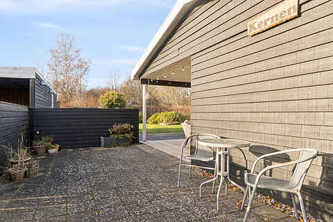 Udenfor finder man en overdækket terrasse med loungemøbler, hvor sommeraftener kan nydes i læ for vinden. Den store grønne græsplæne ligger på en indhegnet grund, hvilket gør det trygt at lade børn og hund færdes frit. Terrassen forlænger dagen og gør udelivet nemt og behageligt.
