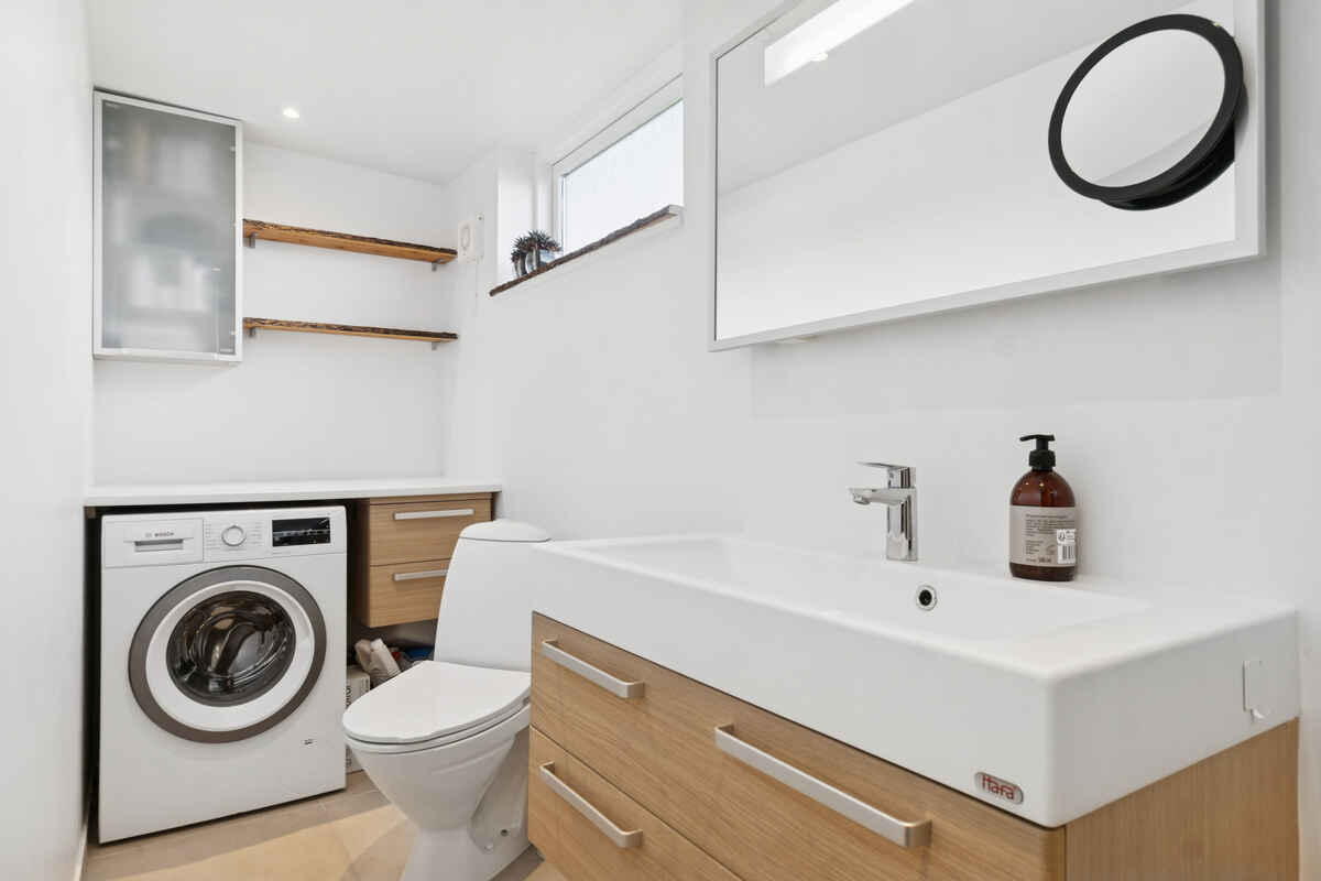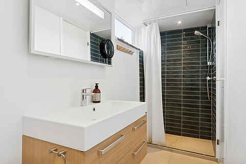 Soveværelserne er lyse og venlige med god plads til seks personer fordelt på tre rum med 3 dobbeltsenge. Sengene er af rigtig god kvalitet, hvilket sikrer en behagelig nattesøvn. Badeværelset har bruseniche og en praktisk indretning, så hverdagen fungerer uden problemer. Huset er let at bruge, også for familier med børn.